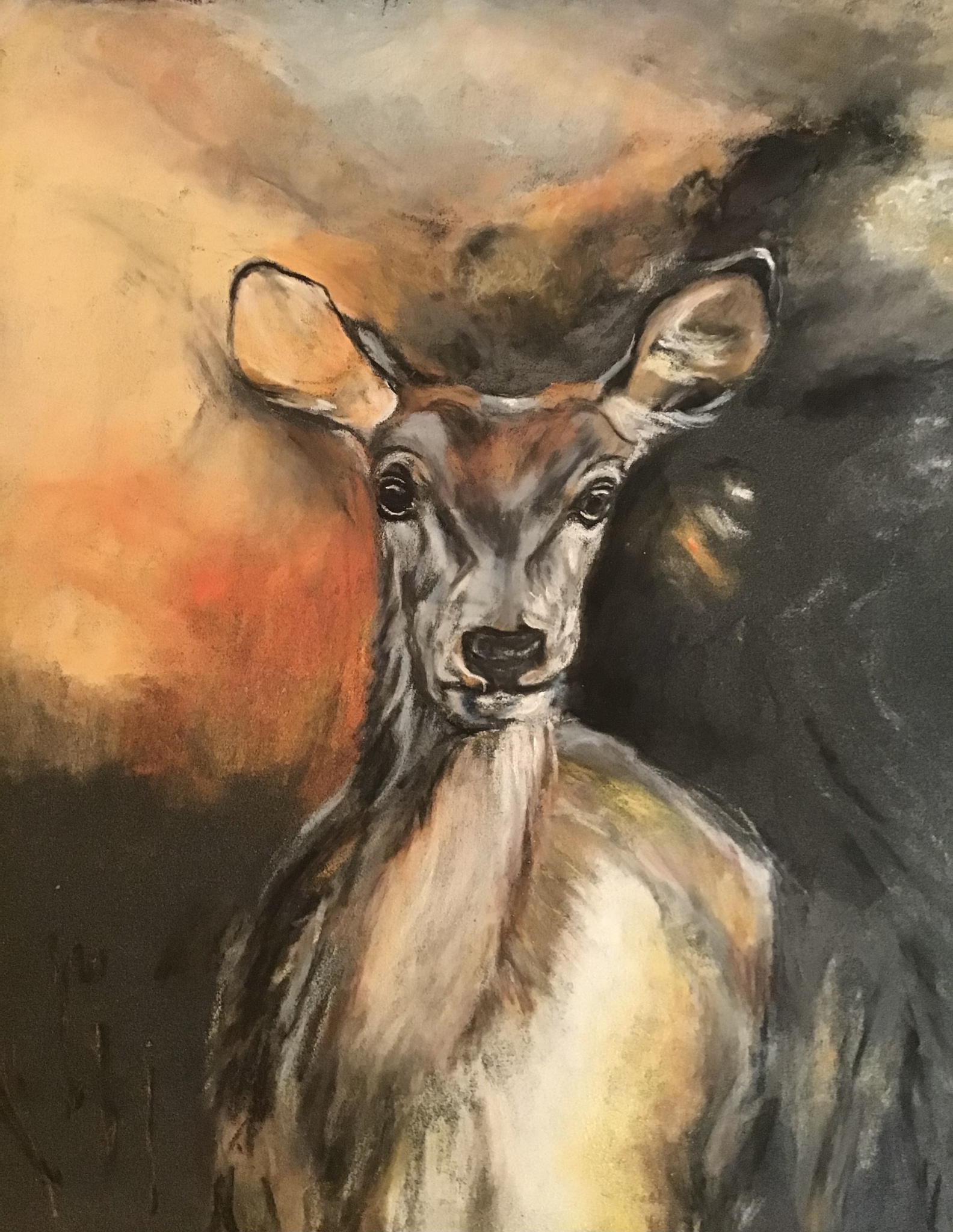 Damhert bij ondergaande zon, pastelpotlood en -krijt.