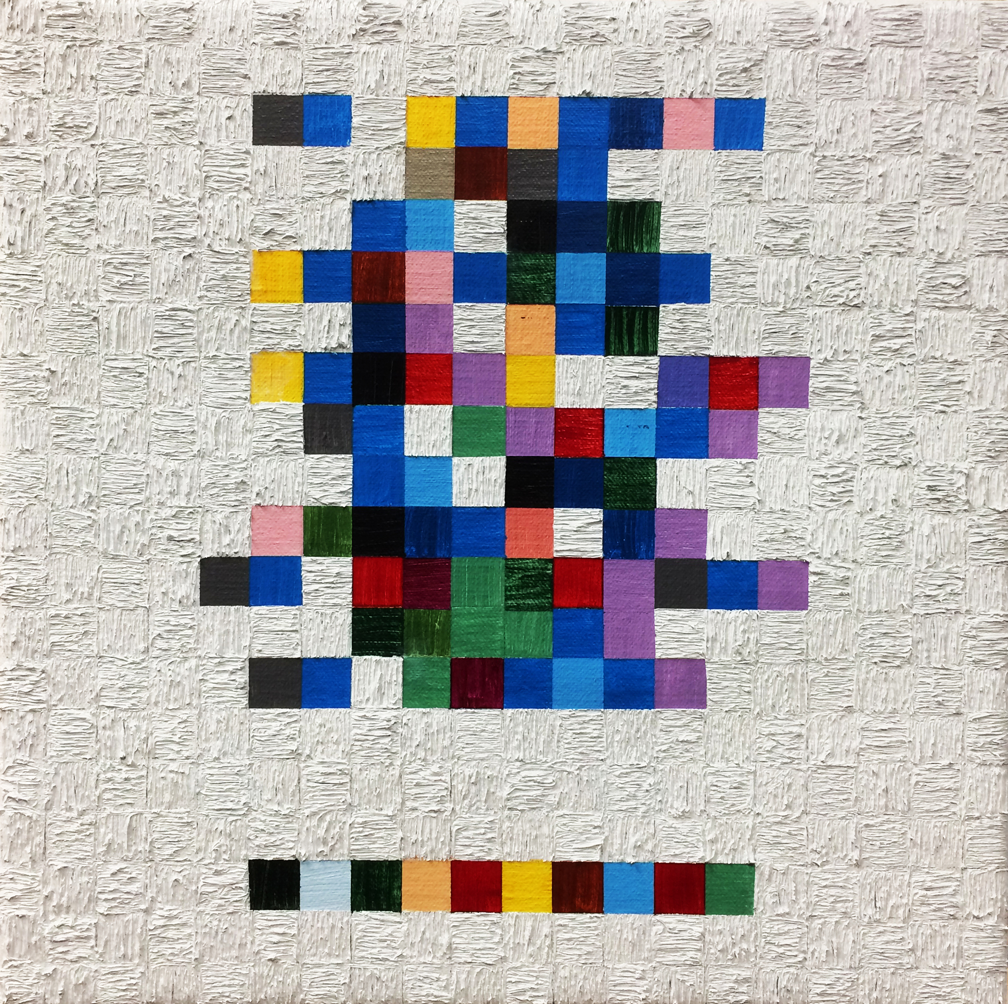 Thema: Chaos (Geometrische Chaos) Mijn kunst is beïnvloedt door de moderne wiskundige en wetenschappelijke benadering van het begrip complexe orde van de natuur. Met name heb ik me verdiept in de Chaos theorie en de fractal geometrie. Ik ben geen wiskundige, en ik gebruik geen wiskundige formules. De ideeën van de Chaos theorie en fractal geometrie leiden tot de ontwikkeling van de composities in mijn werk. Ik gebruik driehoeken,vierkanten en cirkels in mijn schilderijen, maar in mijn huidige serie, geoChao richt ik me alleen op de vierkanten en de verhoudingen tussen de vierkanten. Ik ontwikkel mijn composities door kleine vierkantjes op grote te zetten of grote op kleine te zetten. Het gaat om de onderlinge verhoudingen tussen de vierkanten. Ik laat de methode die ik kies de compositi