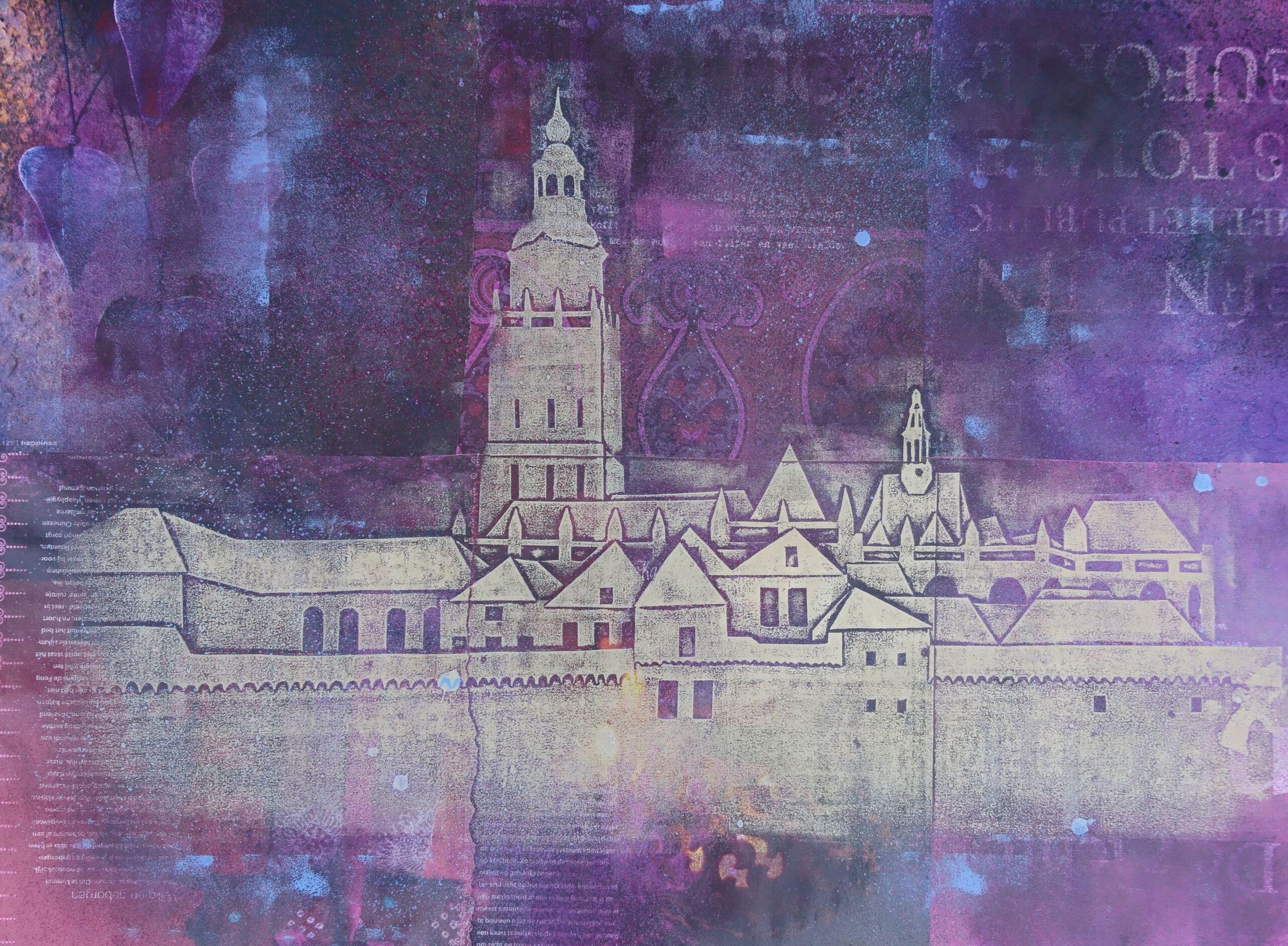 Kartondruk op bewerkt papier van de stadsmuur met Walburgiskerk in Zutphen.