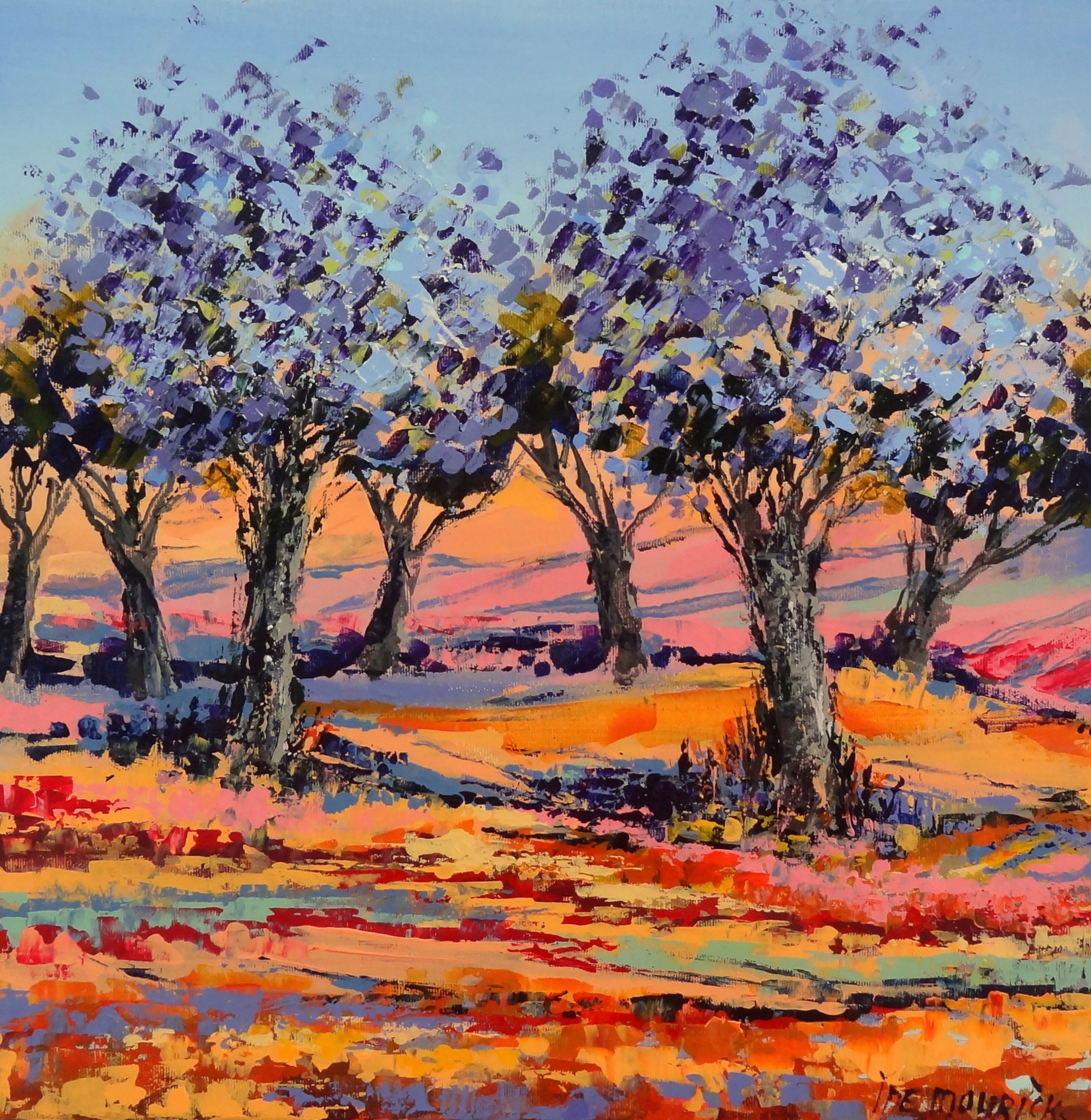 Zuidelijk, kleurrijk landschap met in volle bloei staande Jacarada's. In de korte tijd dat deze bomen in bloei staan, zijn ze fabelachtig om te zien. De kleur van de bloesem kan variëren van licht blauw tot donkerpaaars. Door hun sprookjes achtige uitstraling worden de bomen ook wel "fairytale trees" genoemd. De zijkanten van het doek zijn meegeschilderd en het schilderij wordt beschermd met een satijn vernis. Ingelijst in een houten baklijst in de kleuren zilver en zwart.