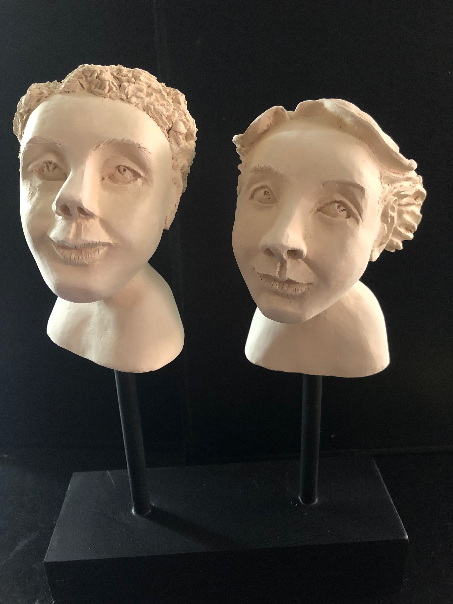2 Witte hoofdjes van keramiek op sokkel en staafjes.