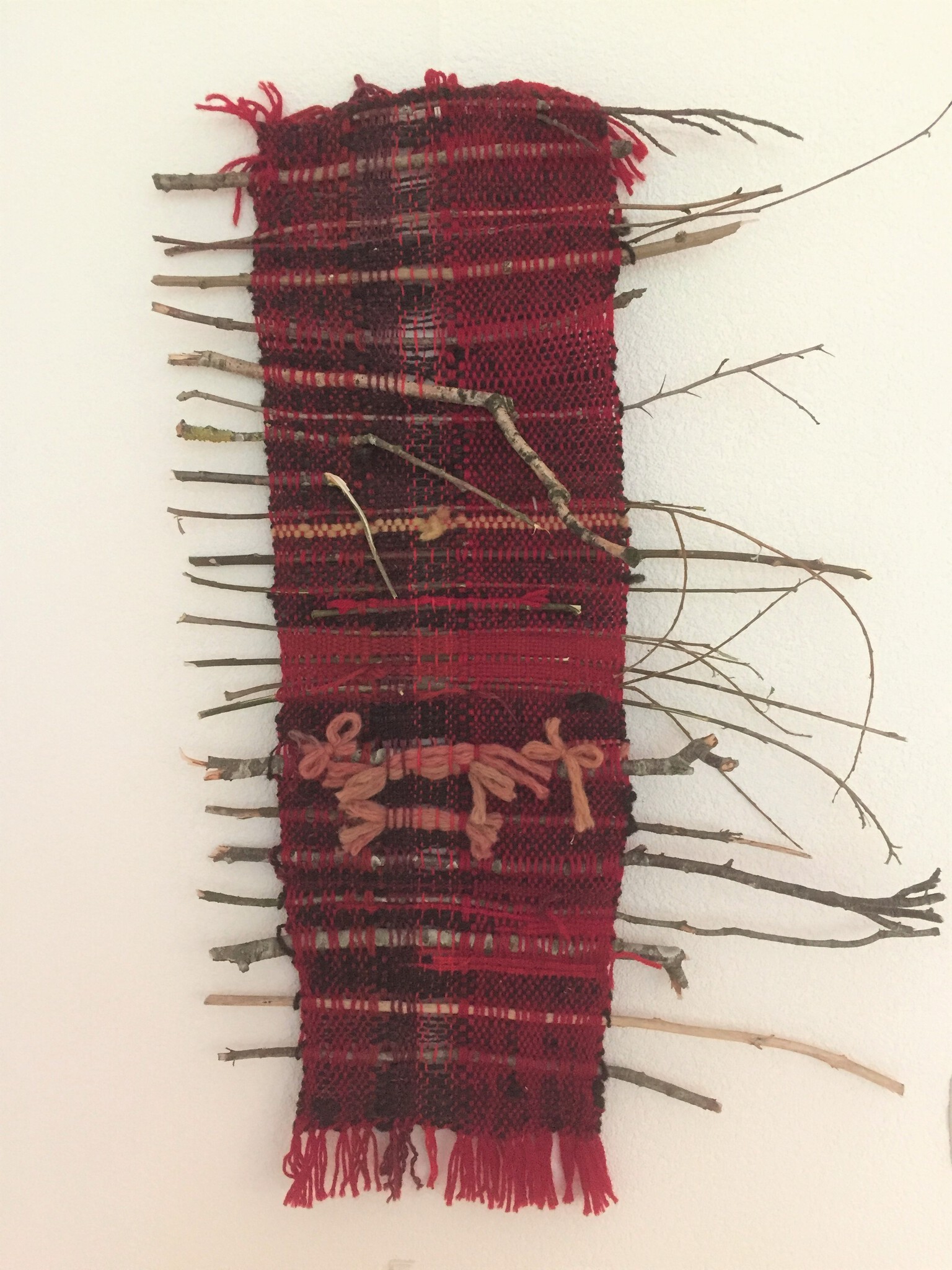 Een spontaan ontstaan weefsel van rode wol en zelfgesponnen wol van Ouessantschapen met gevonden takjes tijdens een wandeling.