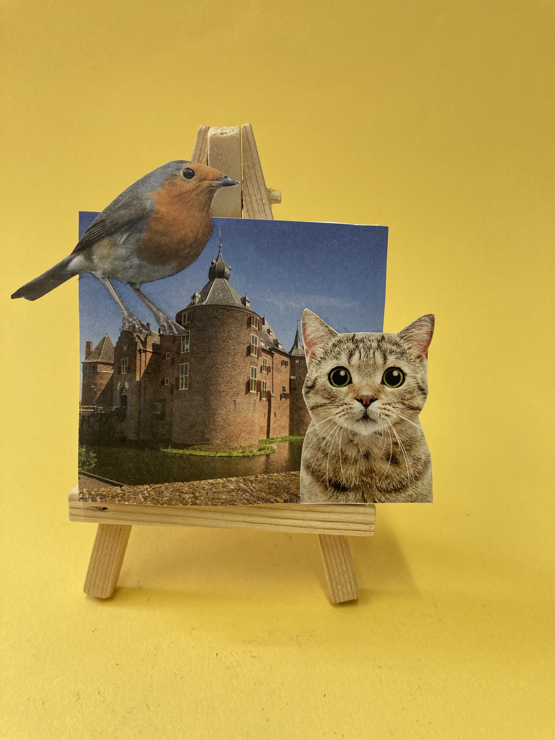 Col -la-ge: samengepakt geheel. Ik verzamel spullen en afbeeldingen. Daarna stel ik ze samen om een decoratief kunstobject te vormen. Humor, verwondering, verbazing, verhalend en stuk voor stuk uniek.