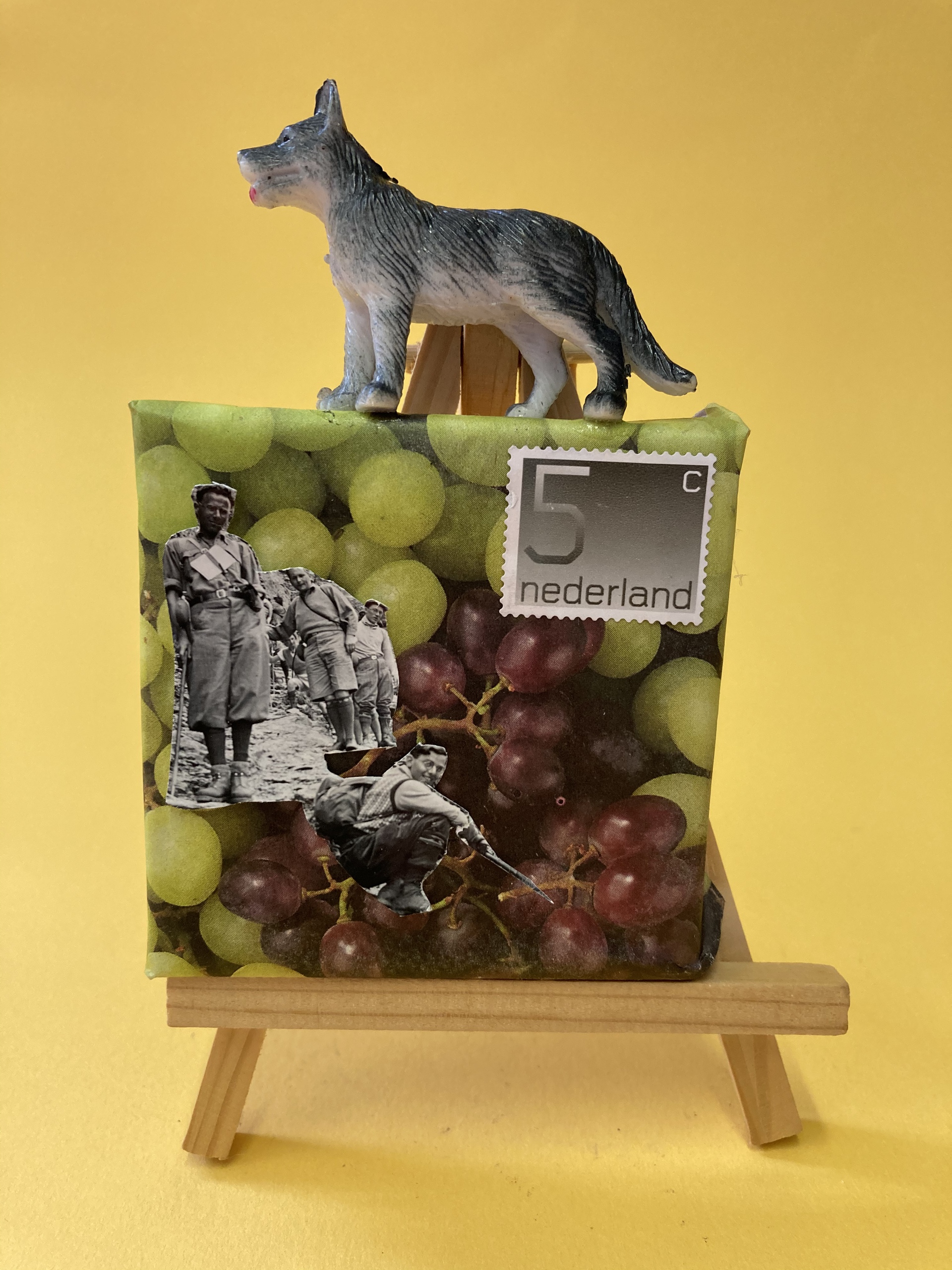 Op een canvas doek op een mini-schildersezel speelt zich een verhaaltje af.