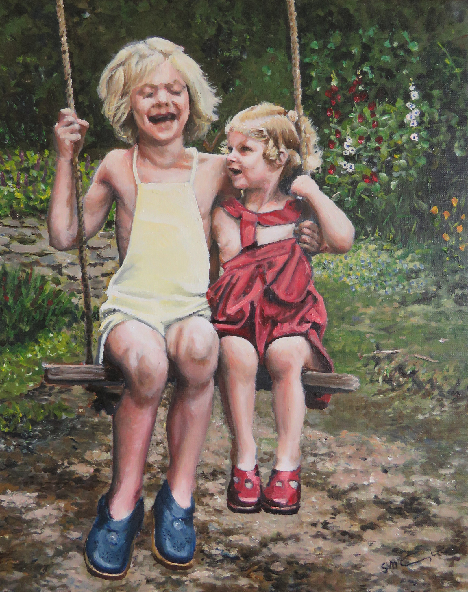 Ergens in de jaren 50 genoten deze zusjes van het schommelen in hun tuin. Wat een plezier in samenzijn. Er was nog een gevlekte grijsgele foto. Ik heb hem kleur gegeven, op dit canvas. De opdrachtgeefster heeft voor haar jeugdherinnering een mooi plekje aan de muur gevonden.