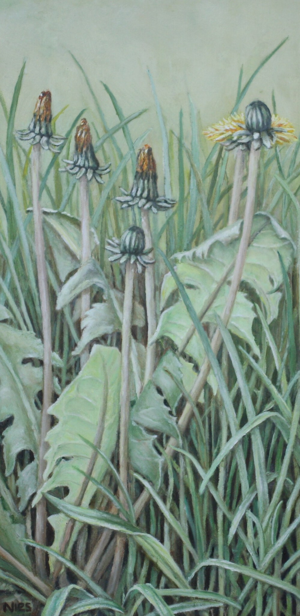 Nies van Dijk schildert met olieverf en eitempera. De dynamiek van vergankelijkheid in de natuur is een terugkerend thema in haar werk.