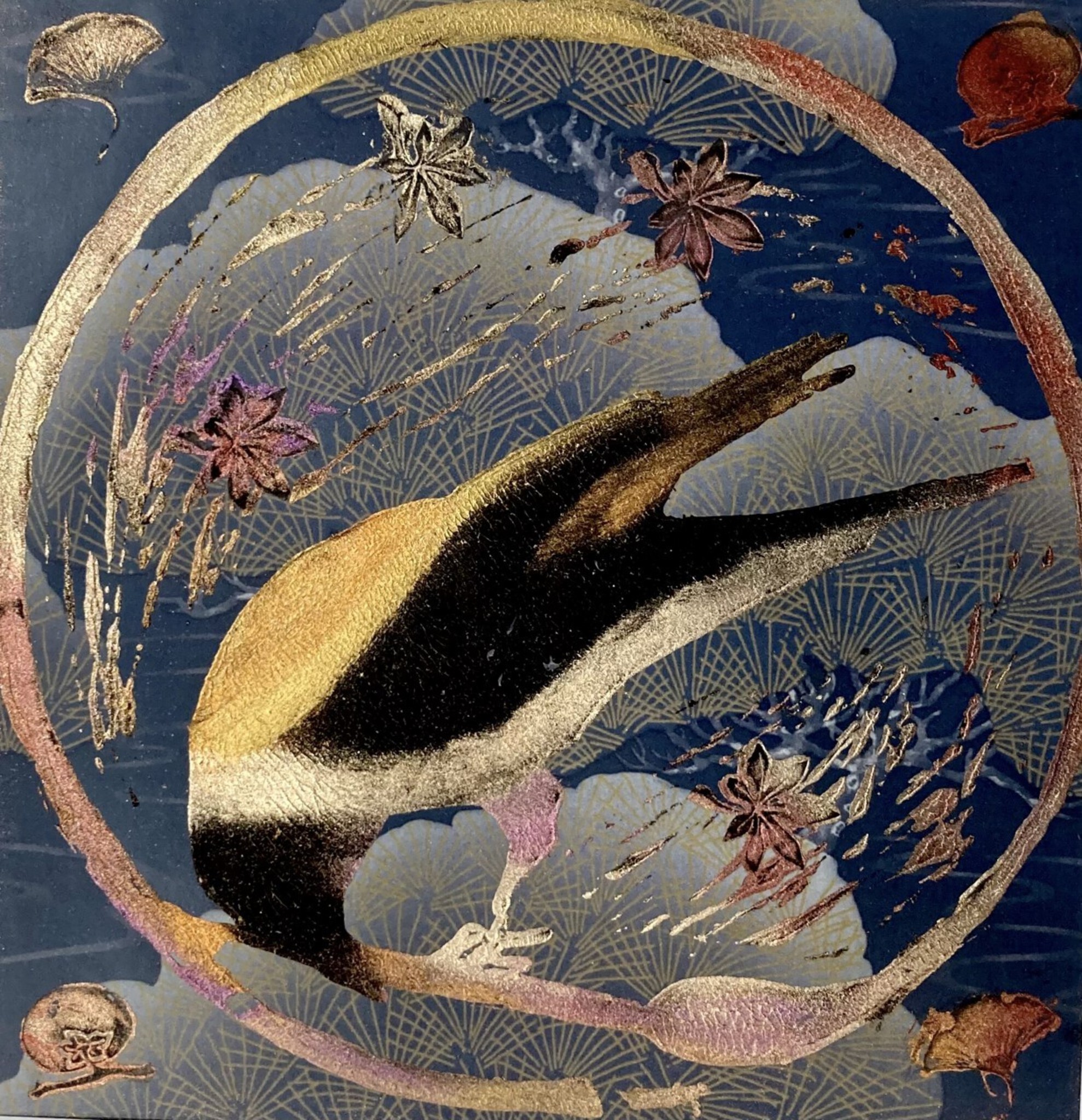 Linoleumdruk en Japanse stempels op gedecoreerde print, bewerkt met metallic poeders -handafdruk - in houten wissellijst met passe-partout 30 x 30 cm.