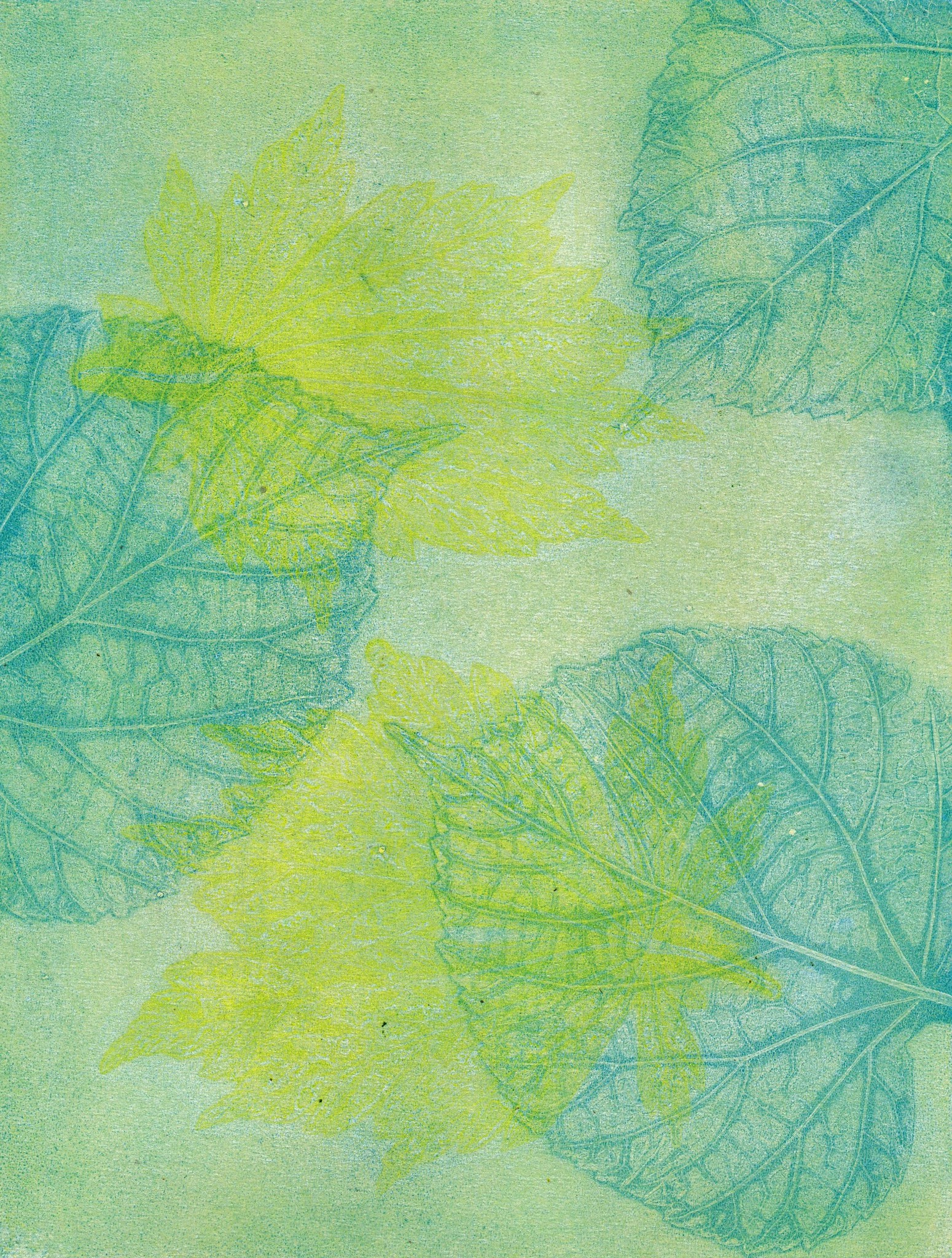 Monoprint met acrylverf op papier, gelaagd werk. Bladerwerk. In mijn kleine tuin en in mijn omgeving verzamel ik bladeren. Deze prints zijn daarmee een afspiegeling van mijn omgeving. Door de bladeren af te drukken, krijg ik meer waardering voor het blad, de details en voor de verschillende soorten bomen en planten om mij heen. De linde is werkelijk overal! Voor de verandering - en vanwege de zomer? - koos ik koele kleuren. Het werk was te zien in de tentoonstelling Koppen en monprints in Utrecht (14 oktober 2021 tot en met 30 januari 2022), Buurthuis de Musketon, Lunetten, Utrecht. Beschikbaar per 15 augustus 2022.