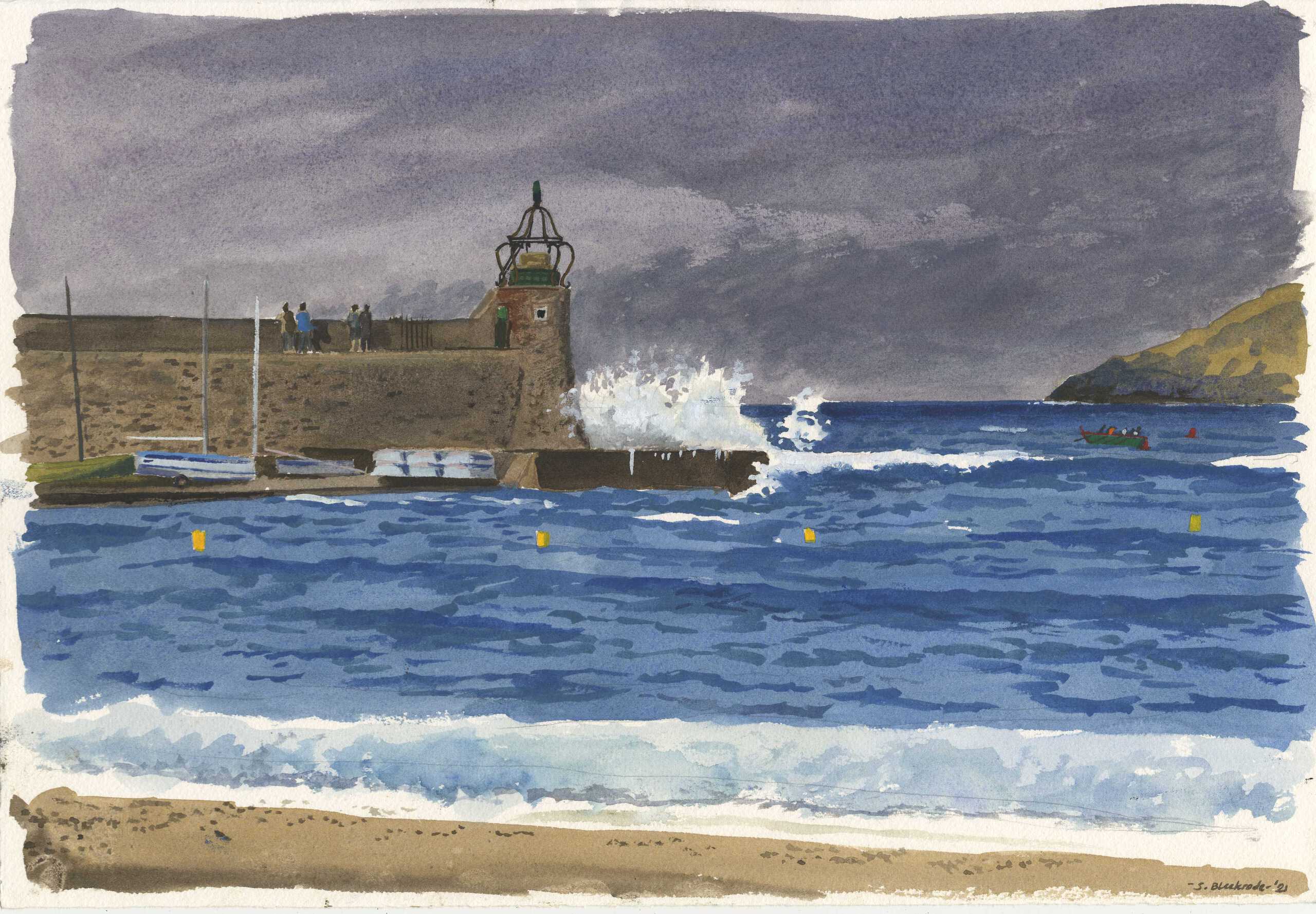 Schilderij Zee Grijs Blauw Blue Frankrijk Aquarel Painting Watercolor Storm Vuurtoren Sea Watercolour France Gray Lighthouse