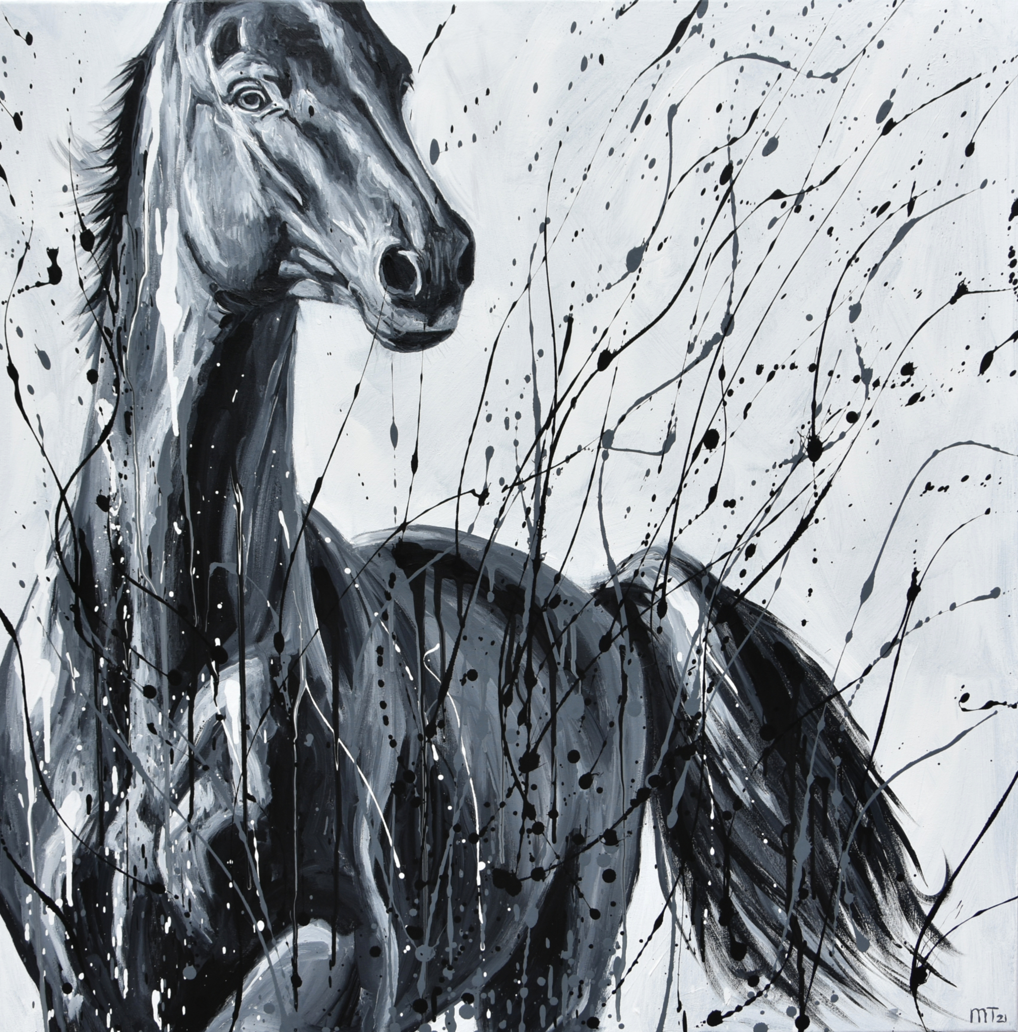 De laatste in deze 'black and white freedom series', omdat negen vierkante schilderijen samen weer een vierkant vormen. Een prachtig zwart paard, gebaseerd op een foto van Christa Merk.