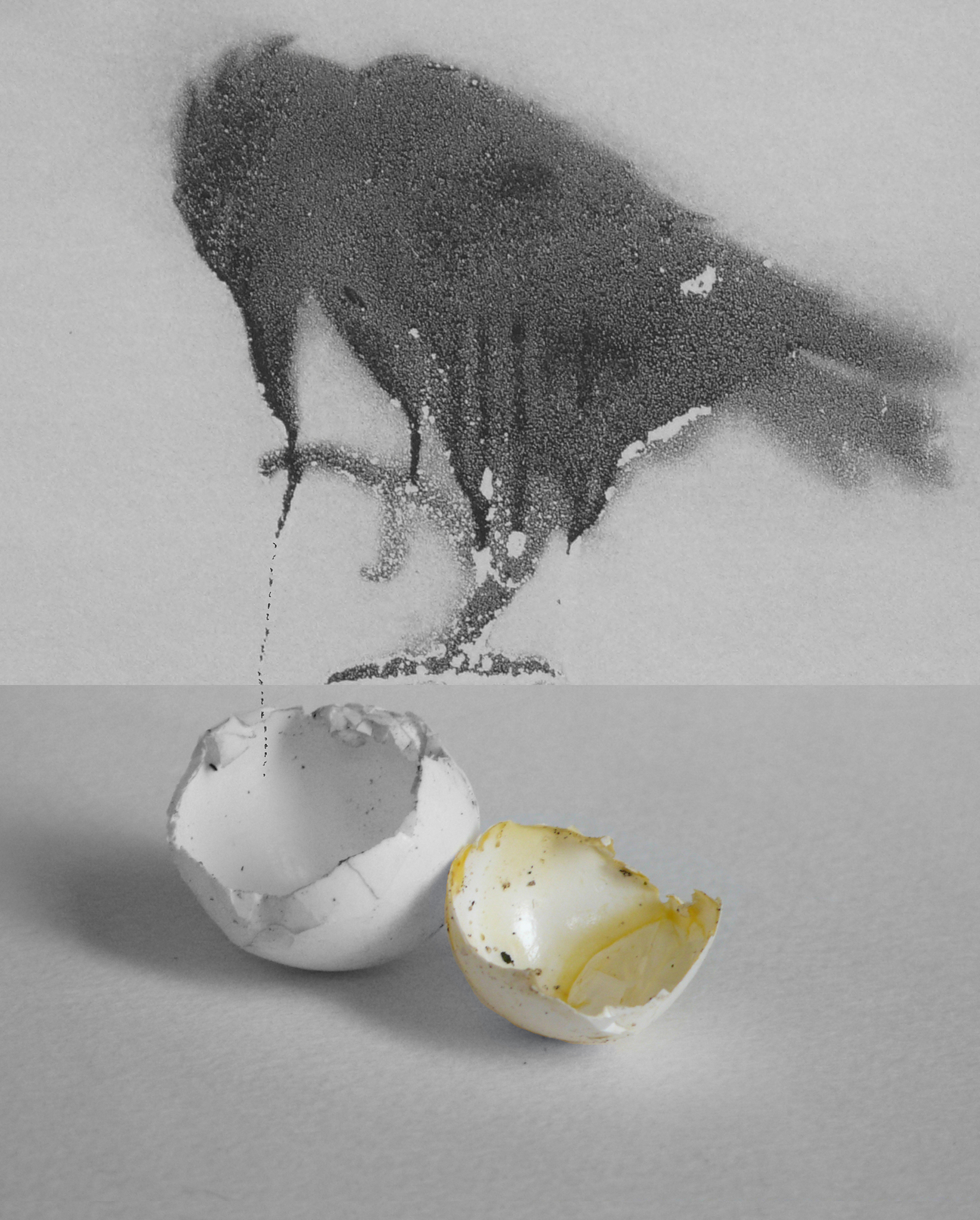 een zelfgemaakte foto van een graffiti kraai en van een op straat gevonden halflege eierdop samengesteld met behulp van Photoshop.