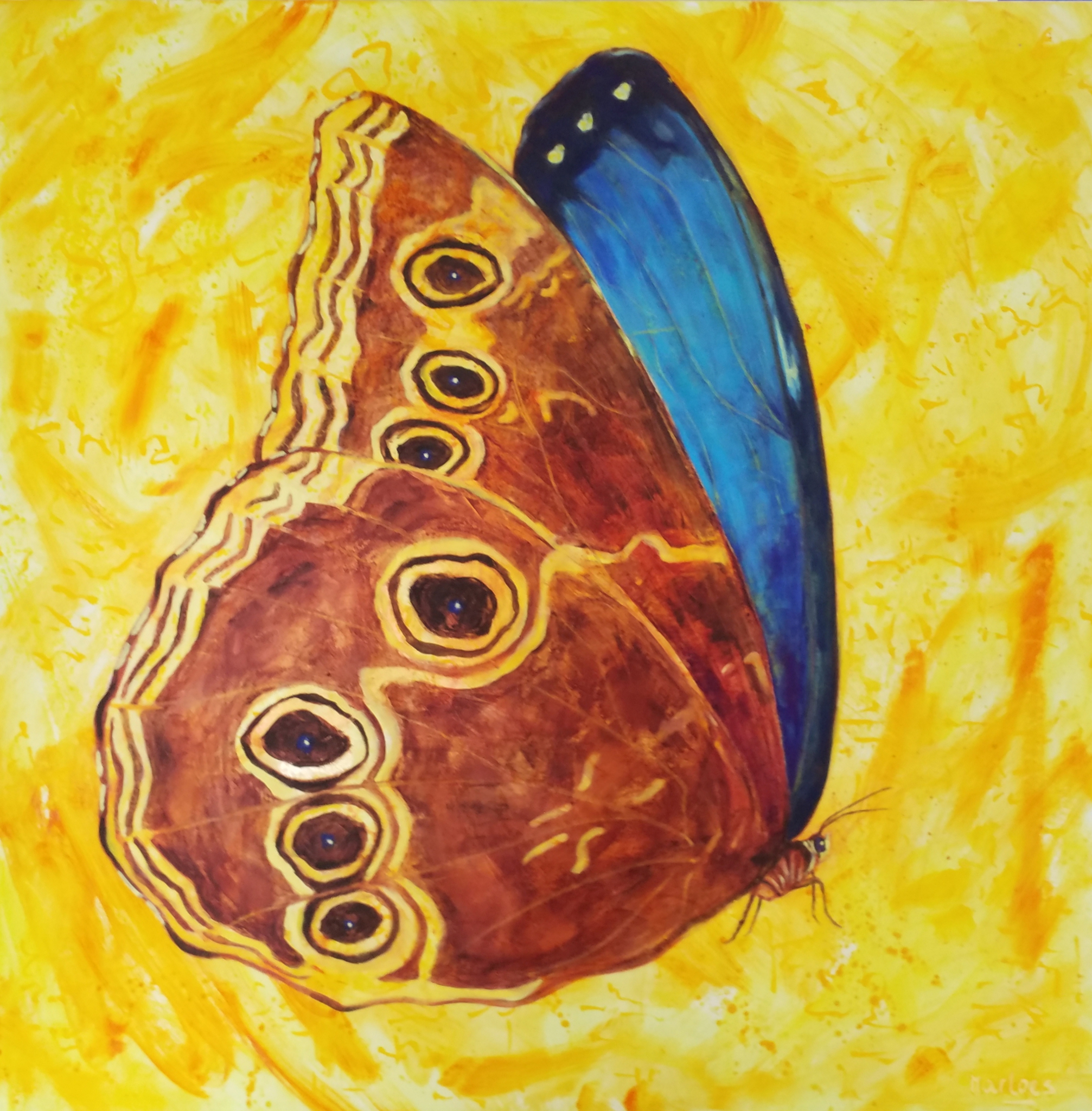 Vlinders hebben vele betekenissen, het oneindige van de ziel en de kortstondigheid van het leven. Ze staan ook voor vrolijkheid, dansen en als symbool voor transformatie, worden wie je bent. Olieverf op paneel, 100 x 100. Niet te koop, in opdracht of Giclée is mogelijk.