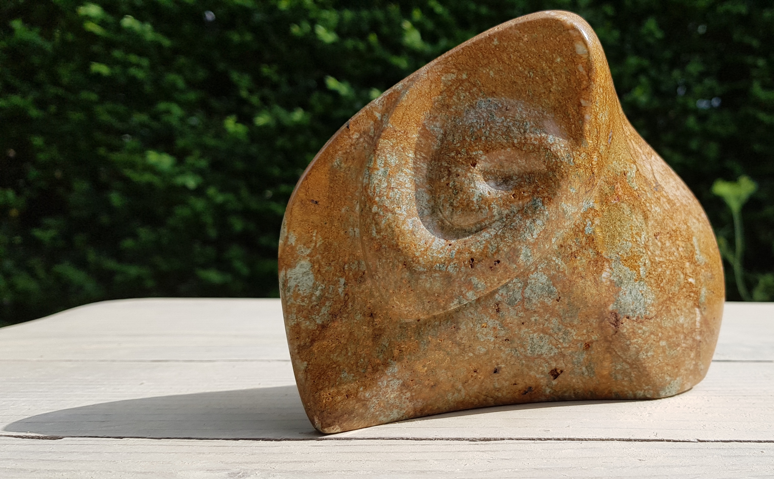 Observerend, met een schuin oog. Uitgevoerd in Braziliaans speksteen.