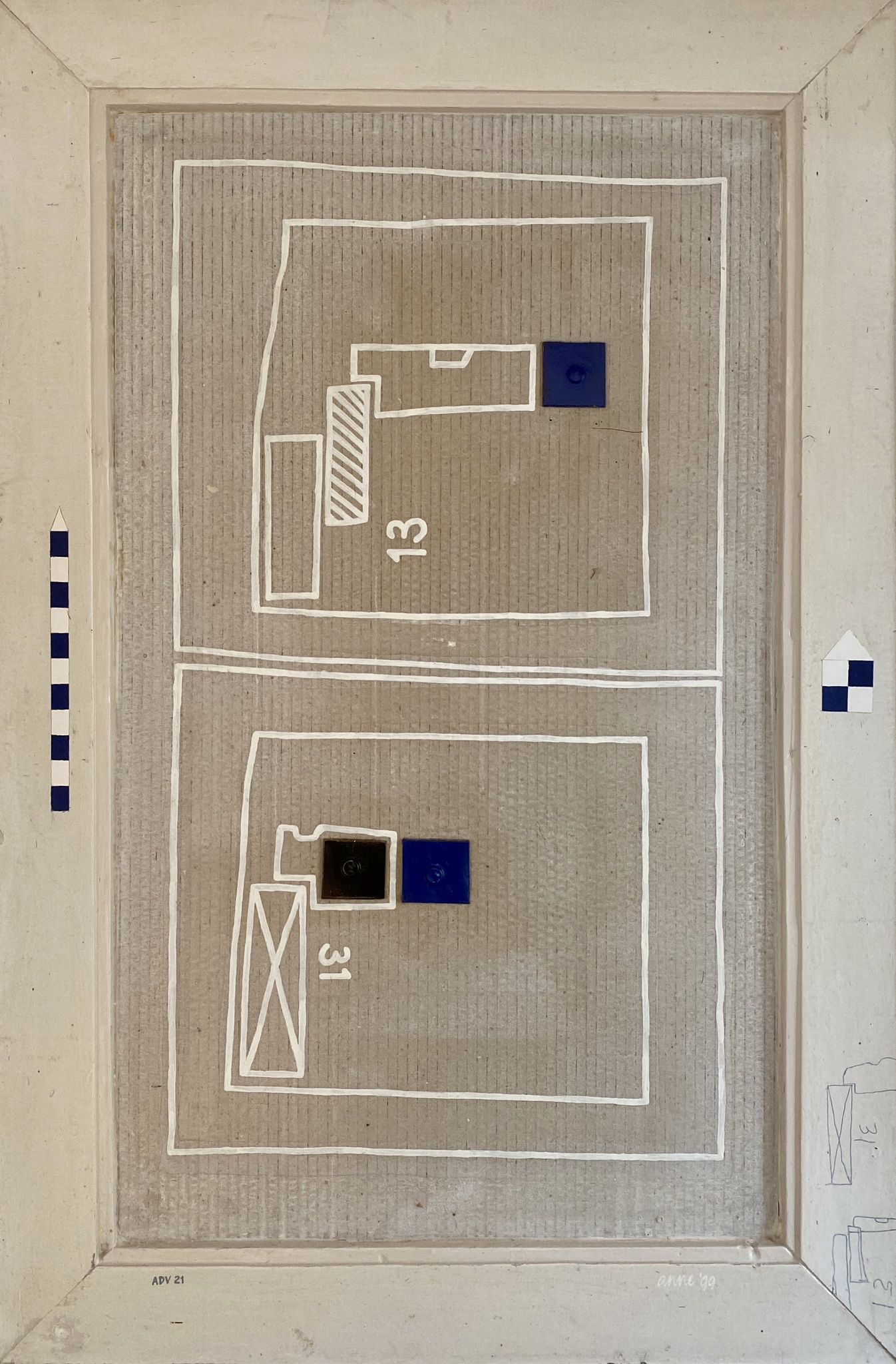In 1999 kreeg ik een wit geverfde plank met een intrigerende berekeningsschets (zie lijst rechtsonder). Die schets heb ik in 1999 toegepast in een afbeelding op karton. Het karton is deels bedekt met lijm en een dunne witte verflaag. Op de lijst heb ik tekens in wit en blauw aangebracht en op het kartongedeelte 3 vierkante metalen plaatjes. In 2021 is het werk gerenoveerd.