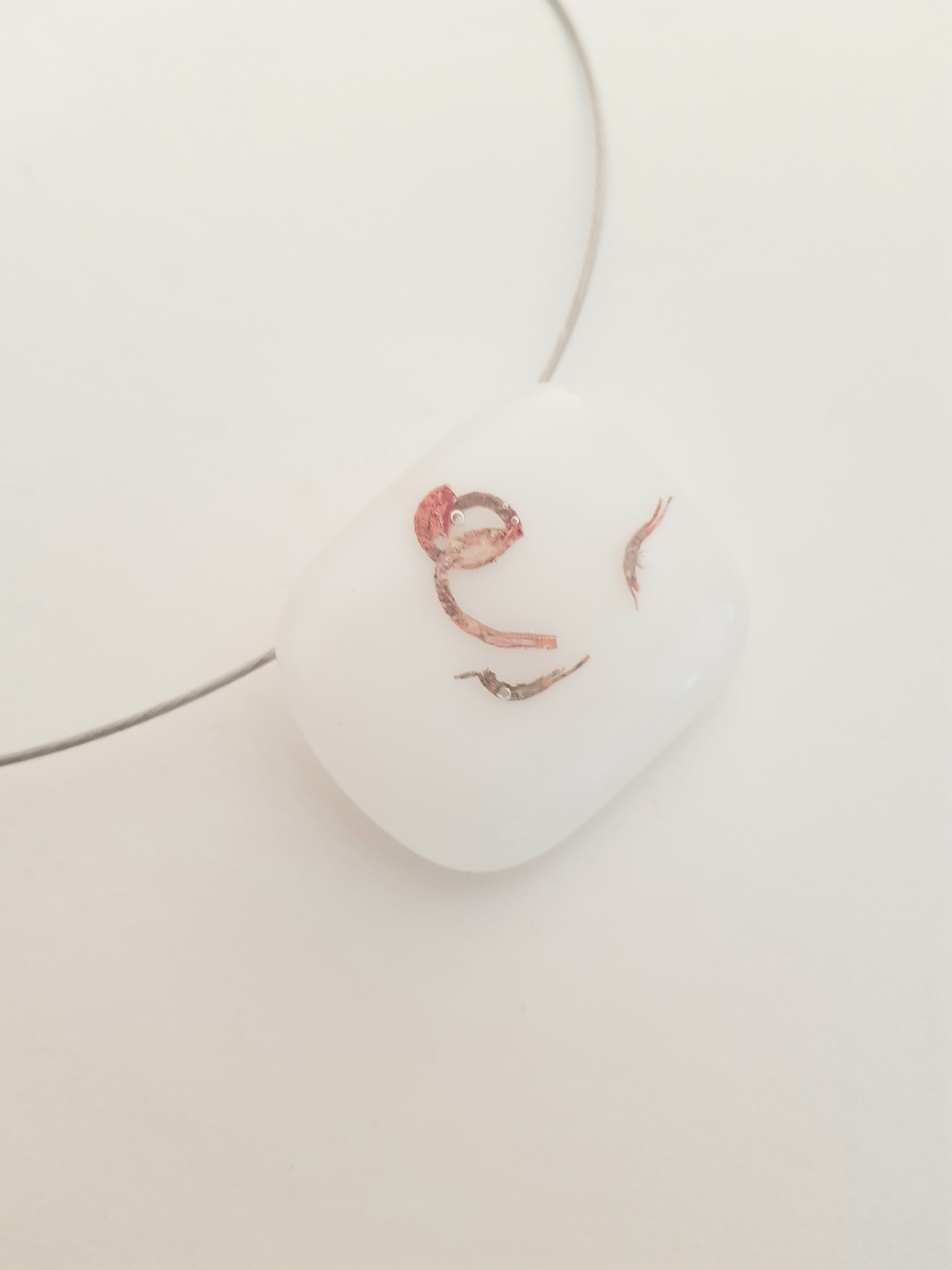 Lieve Glashanger van wit glas met ingelegd koper in een bloemvorm - een roosje-. Zeer subtiel, maar wonderschoon gelukt. Ze staat prachtig op een wat donkere huidtint. Het gewicht van de hanger is 19 gram. ik doe er een klein collier bij, waardoor mooi langs de hals valt. De hanger is 3,5 cm breed en de lengte is 3 cm. Ik pak het cadeau kunstzinnig in, zodat het leuk is om te krijgen en te geven. ( wel duurzaam, met hergebruik van materialen ) De prijs is inclusief verzendkosten