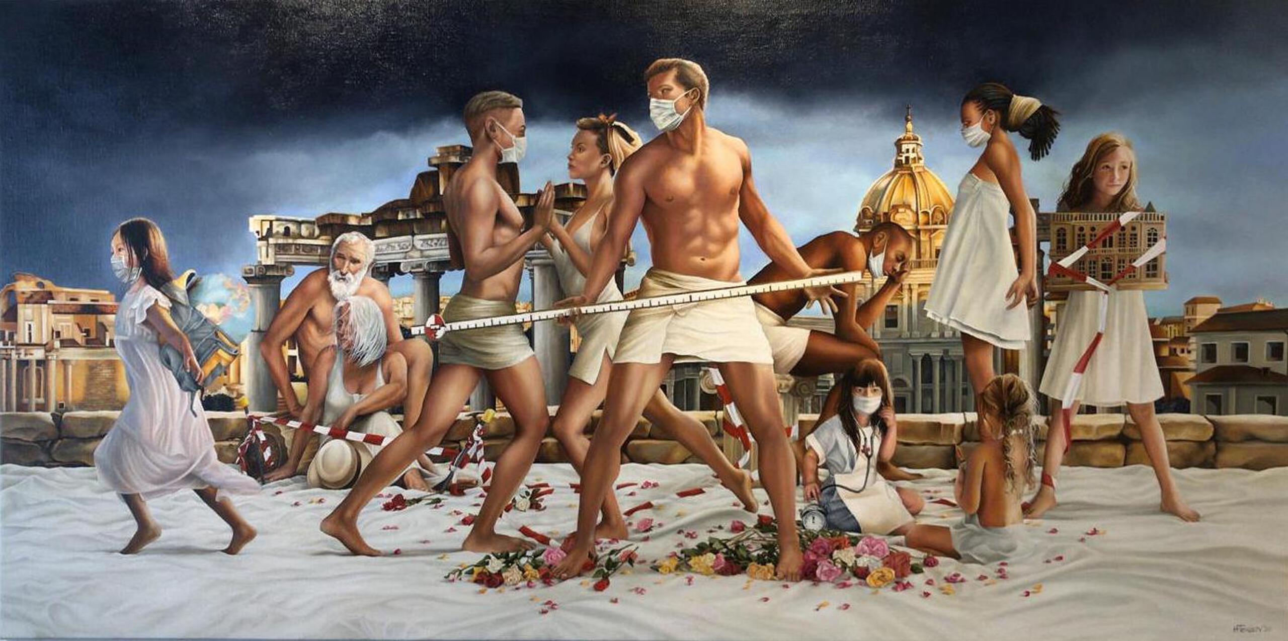 Geschilderd tijdens de lockdown. Het moment dat het coronavirus europa binnenkwam.. Met op de achtergrond een stukje antiek Rome. Olieverf en Alkyd Verkrijgbaar als giclée (print op linnen) www.tresart.nl