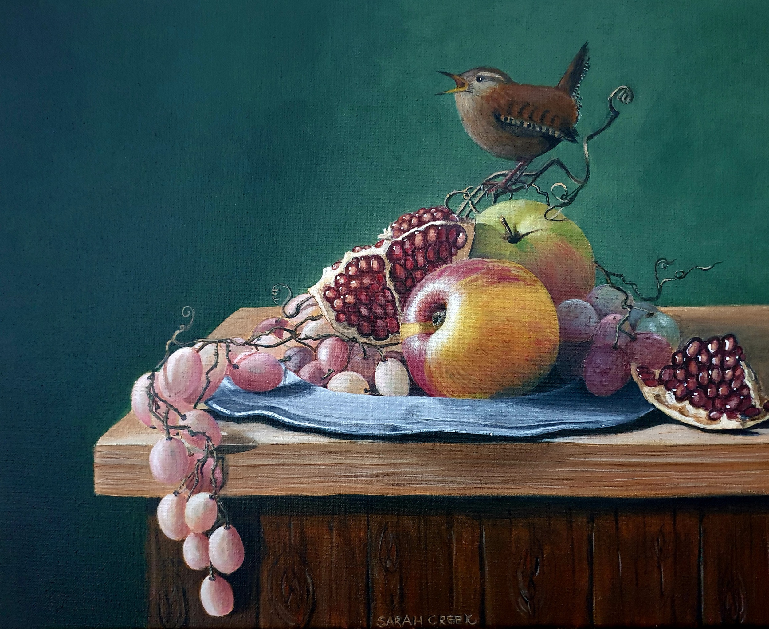 Sarah Creek schildert met acryl op canvas of linnen. Onderwerpen zijn portretten en stillevens. Sarah geeft les aan 55 talentvolle cursisten in een atelier aan huis.