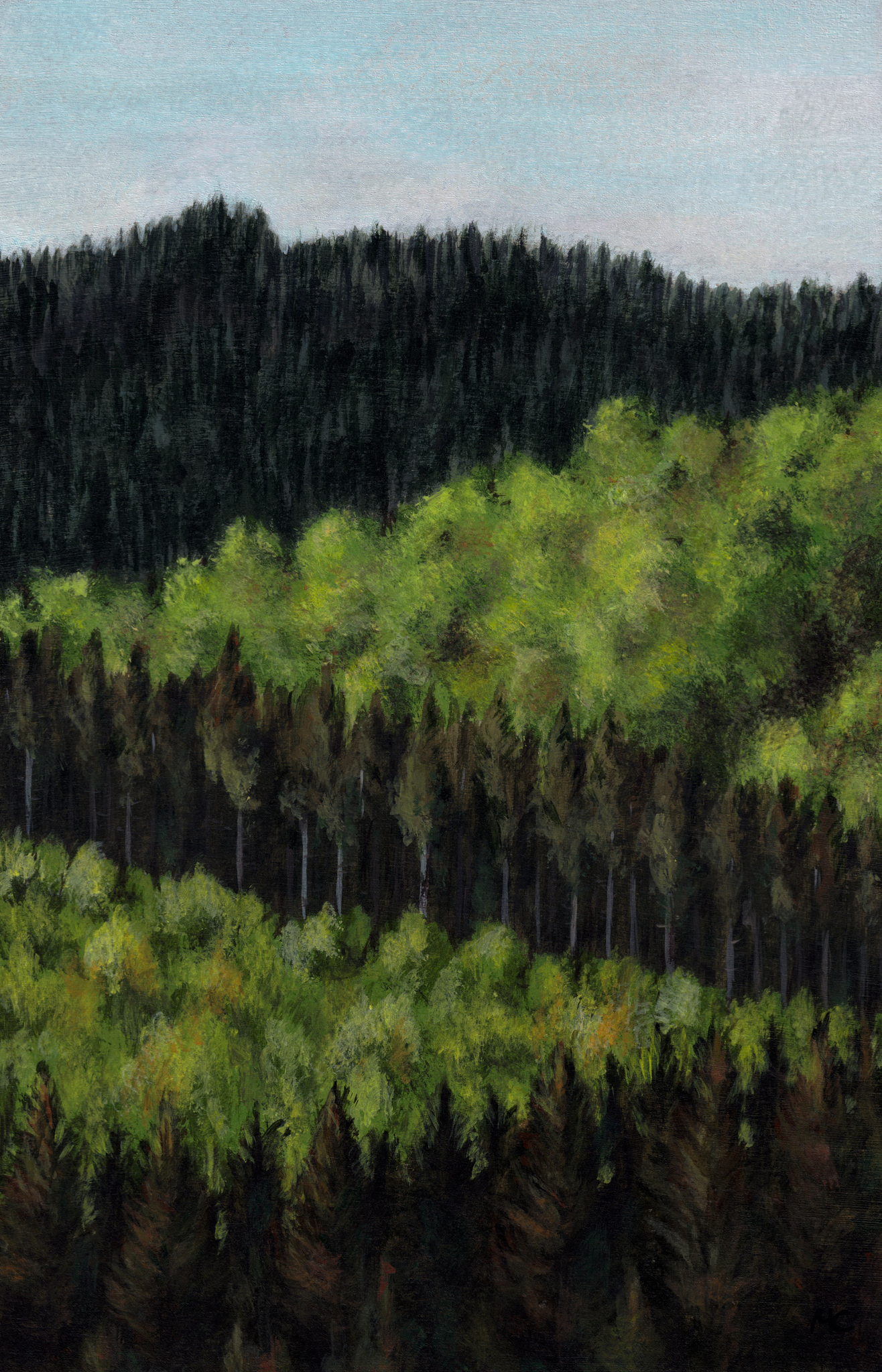 Acrylverf schilderij op papier Heuvel landschap in Sauerland met dennebomen en loofbomen Formaat: 24x16cm (schilderij 23x15cm), incl bijgeleverde passe-partout 29,7x21cm (A4) Papier: Canson Acrylverf papier 400gr