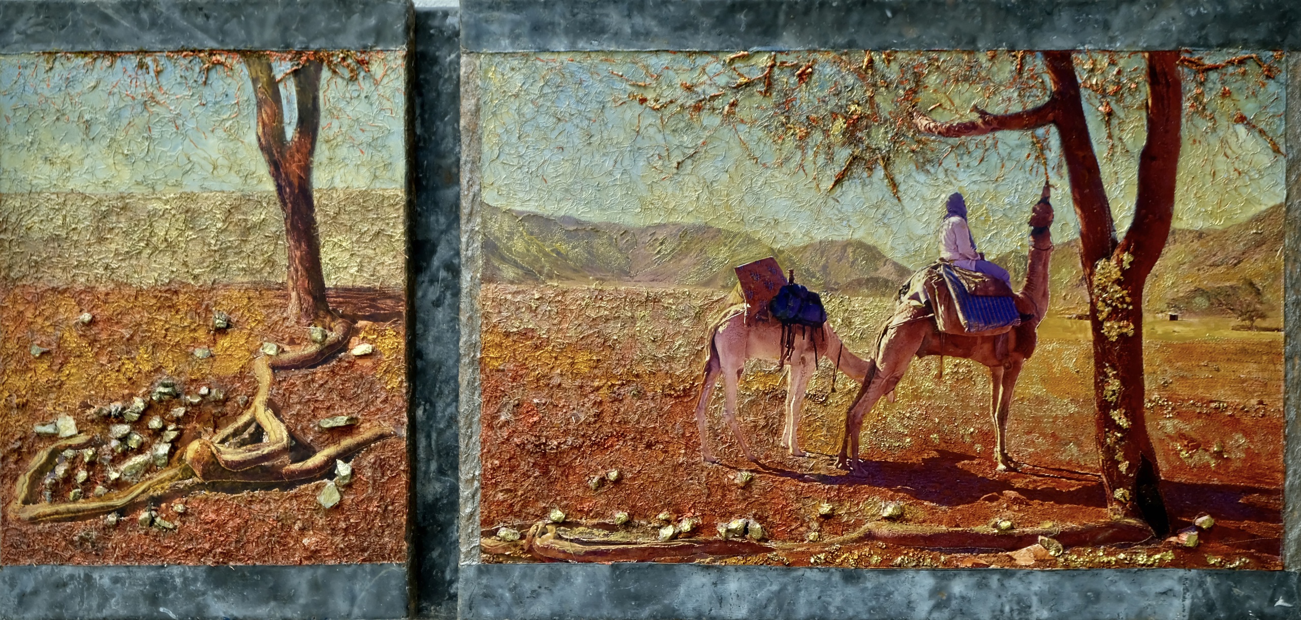 Tweeluik. Kameel eet van een boom tijdens een tocht door de woestijn. Bomen hebben luchtwortels. Mixed media, fotografie, draadjes, zand, steentjes ioniserende verf