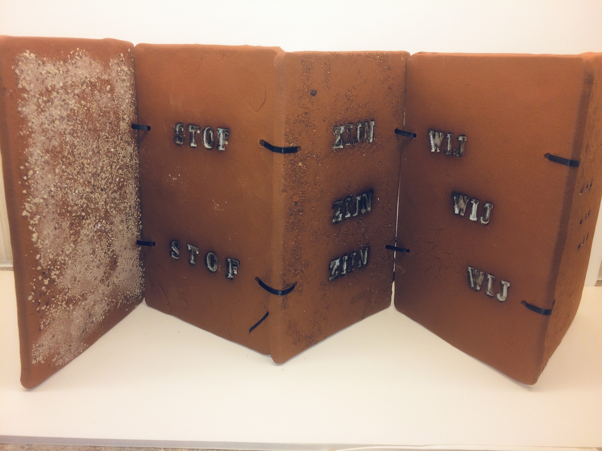 leporello, getiteld 'klei', van kleitabletten; tekst: stof - zijn - wij - ...
