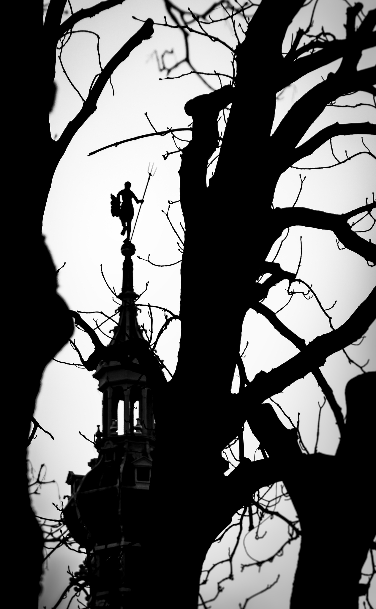 Als symbool, in kunst en mythologie komt de drietand voor in diverse culturen. Trident is een Frans woord en op zijn beurt weer ontleent aan Latijn; tri is drie en dent betekent tanden. De drietand staat het meest bekend als het traditionele wapen om vis te spiesen, maar komt bijvoorbeeld ook voor in het Hindoeïsme als ‘Trishula’, één van de attributen van de god Shiva. In de astronomie is het symbool voor de planeet Neptunus ook een drietand ♆. De drietand op deze foto wordt vastgehouden door Neptunus, de zeegod. Het huidige beeld op de torenspits van het Stadhuismuseum in Zierikzee dateert uit 1964. Een verguld beeld wat dienst doet als windwijzer, wakend over de stad. De drietand die hij vast houdt komt van een eerder exemplaar uit 1853. De foto is genomen op de ‘Hem’ (Schuithaven) in Zierikzee. Fietsend het ‘Hoeltje’ af, het smalste straatje van de stad, viel mijn oog erop: Neptunus rees, zo beeldde ik me in, op vanuit de winterse kastanjebomen.