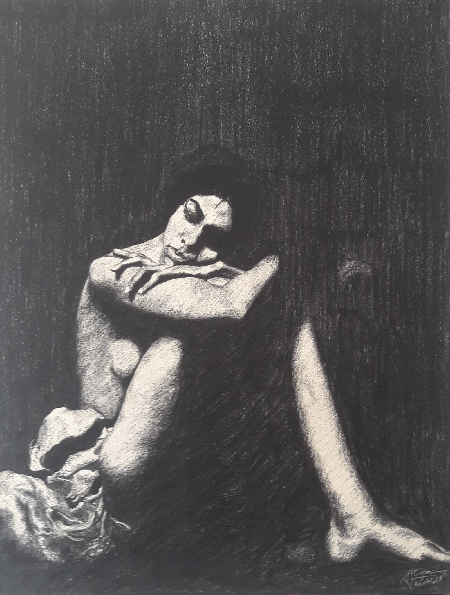 Dit is een heel oud werkje van mij. Naar mijn herinnering is dit gebaseerd op een schilderij waarvan ik een afdruk in een tijdschrift zag. Het is uitgevoerd in zwart conté potlood.