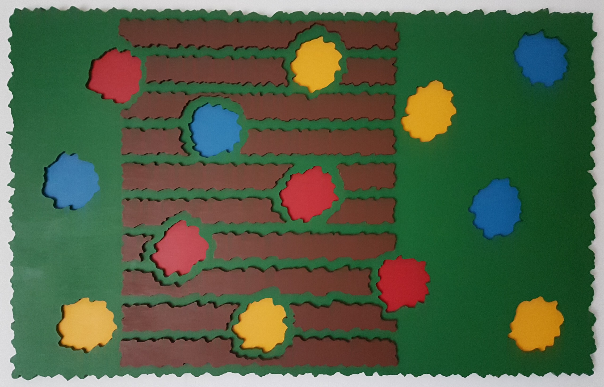 Kleuren en vormen quasi nonchalant over een vlak verdeeld.