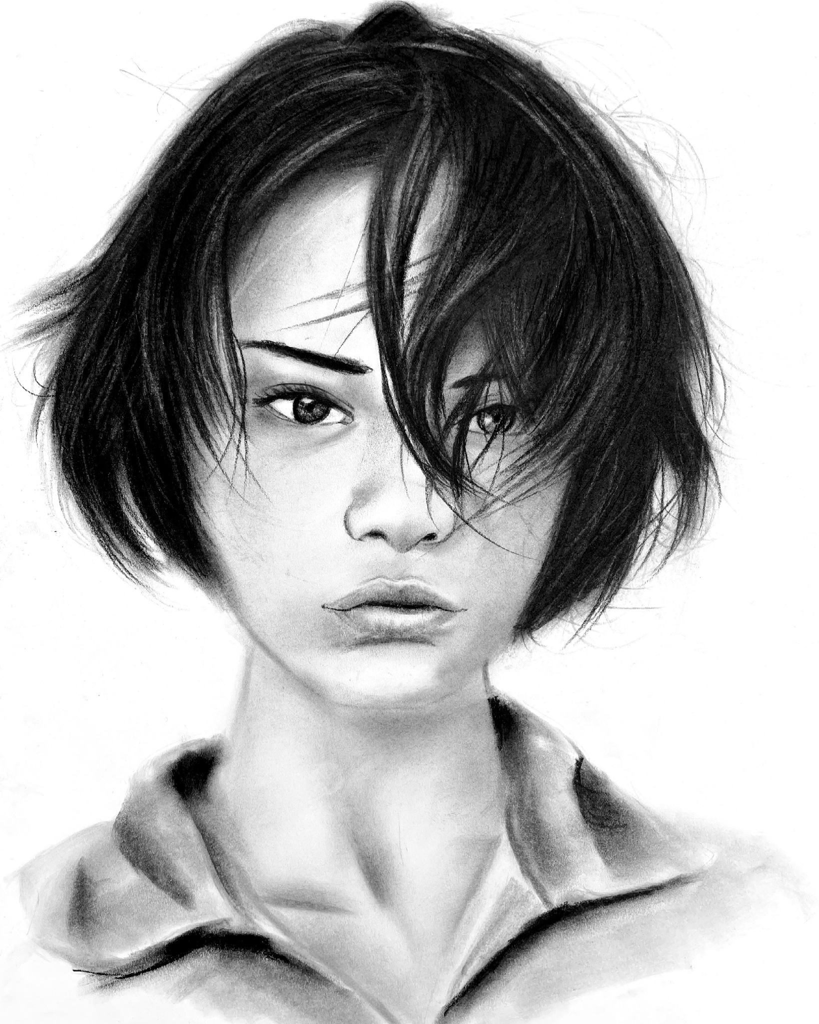 Meisje Haar Portret Houtskool Realistisch