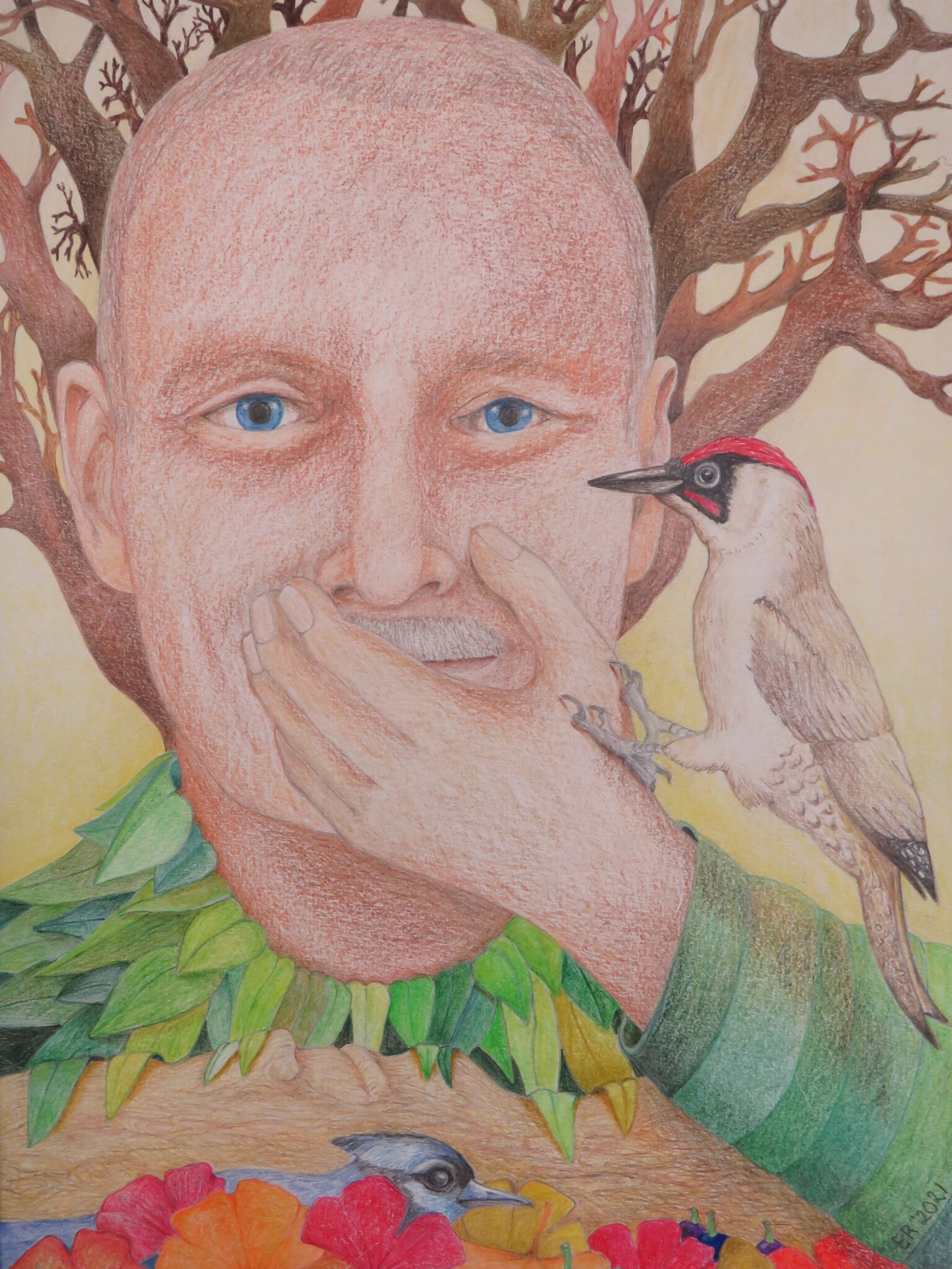 Oude Man Dode Bomen Fris Groen Herfstige Bladeren Blauwe Gaai Specht
