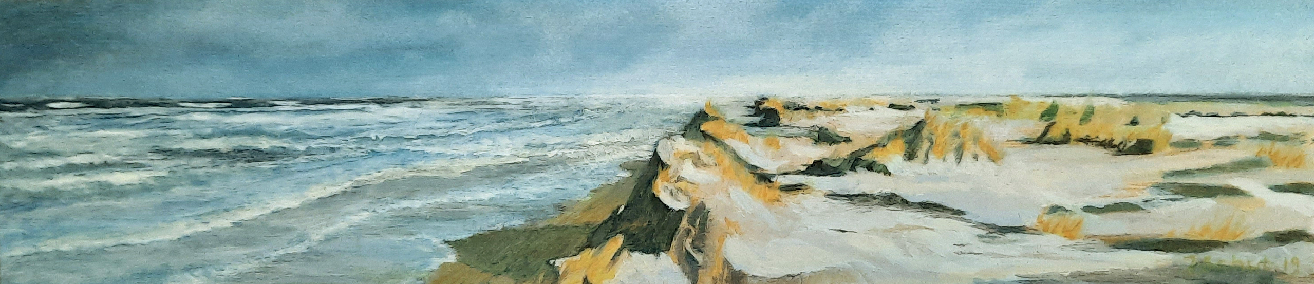 Sneeuw ligt in de duinen. Het dorre gras geeft nog wat kleur.