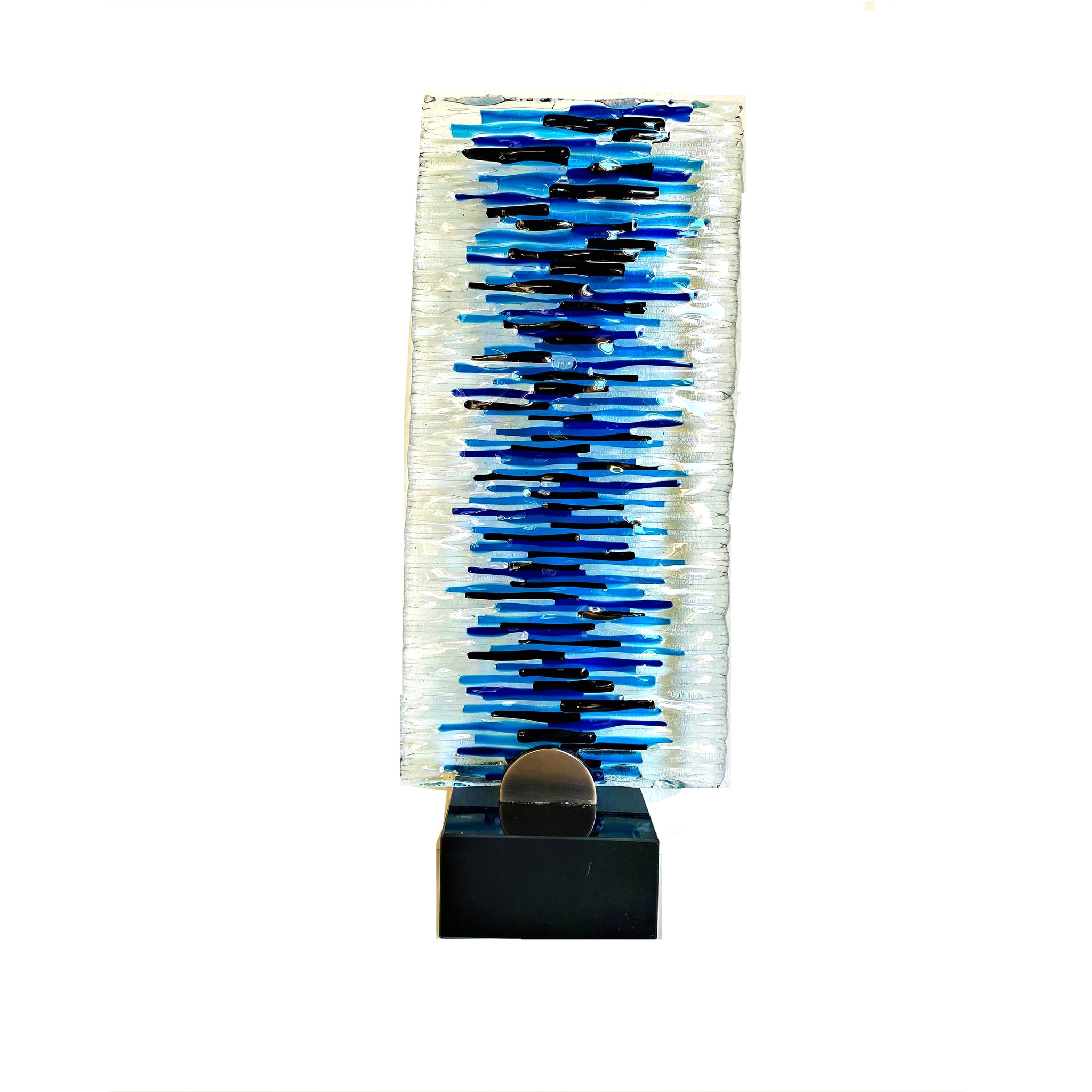 soundbite blue, op voet van zwart marmer, ook met de zg. stapelingstechniek: dik glas met een speciale lichtinval, anders en afhankelijk van afstand en plaats waarvan men het object bekijkt.