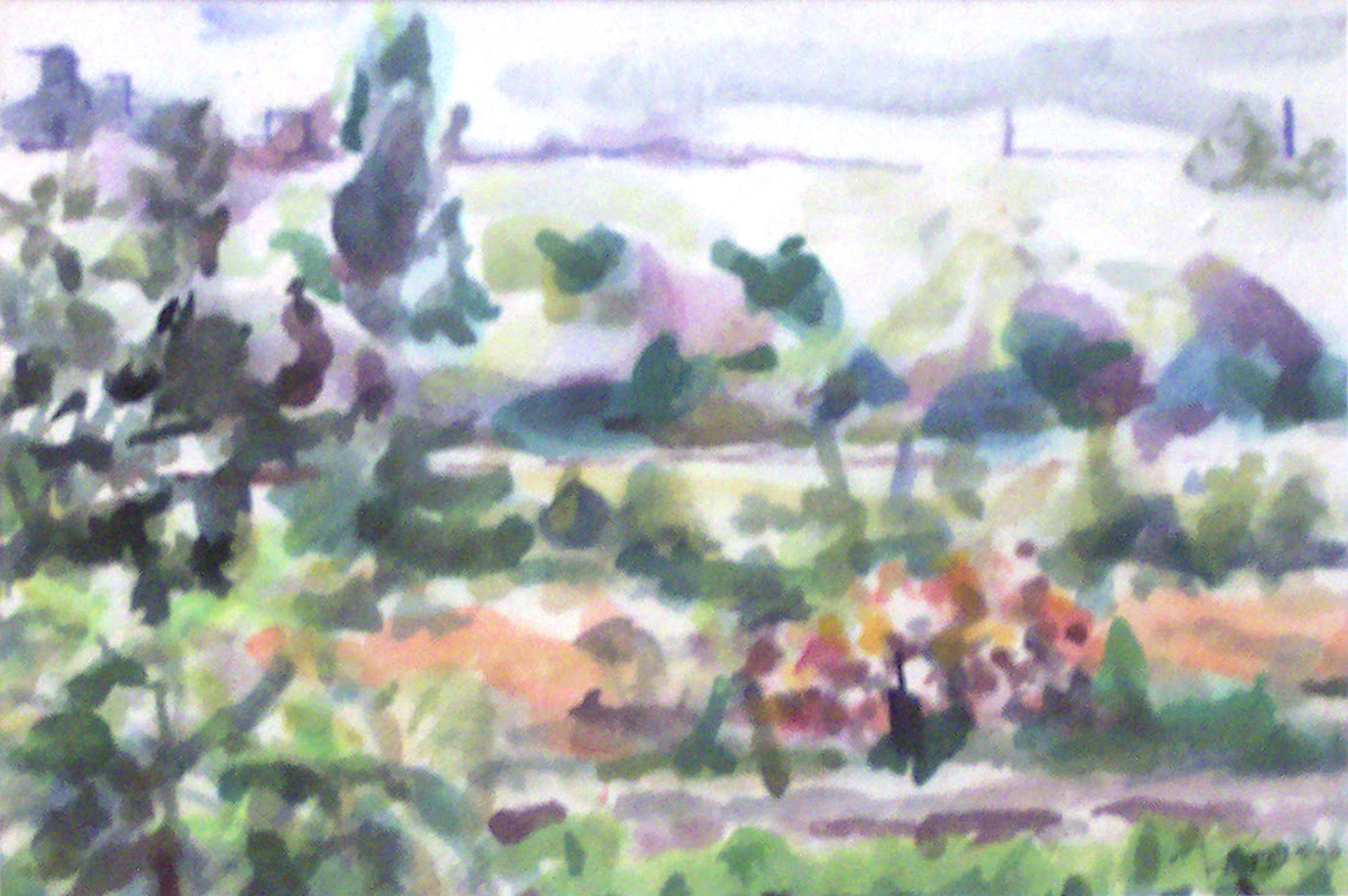 'Zicht op Schiphollijn 2' Wederom vanuit mijn toenmalige huiskamer in Bos & Lommer geschildeerd. Dit maal op Japans papier dat erg zuigt en bijna te vergelijken is met vloeipapier.