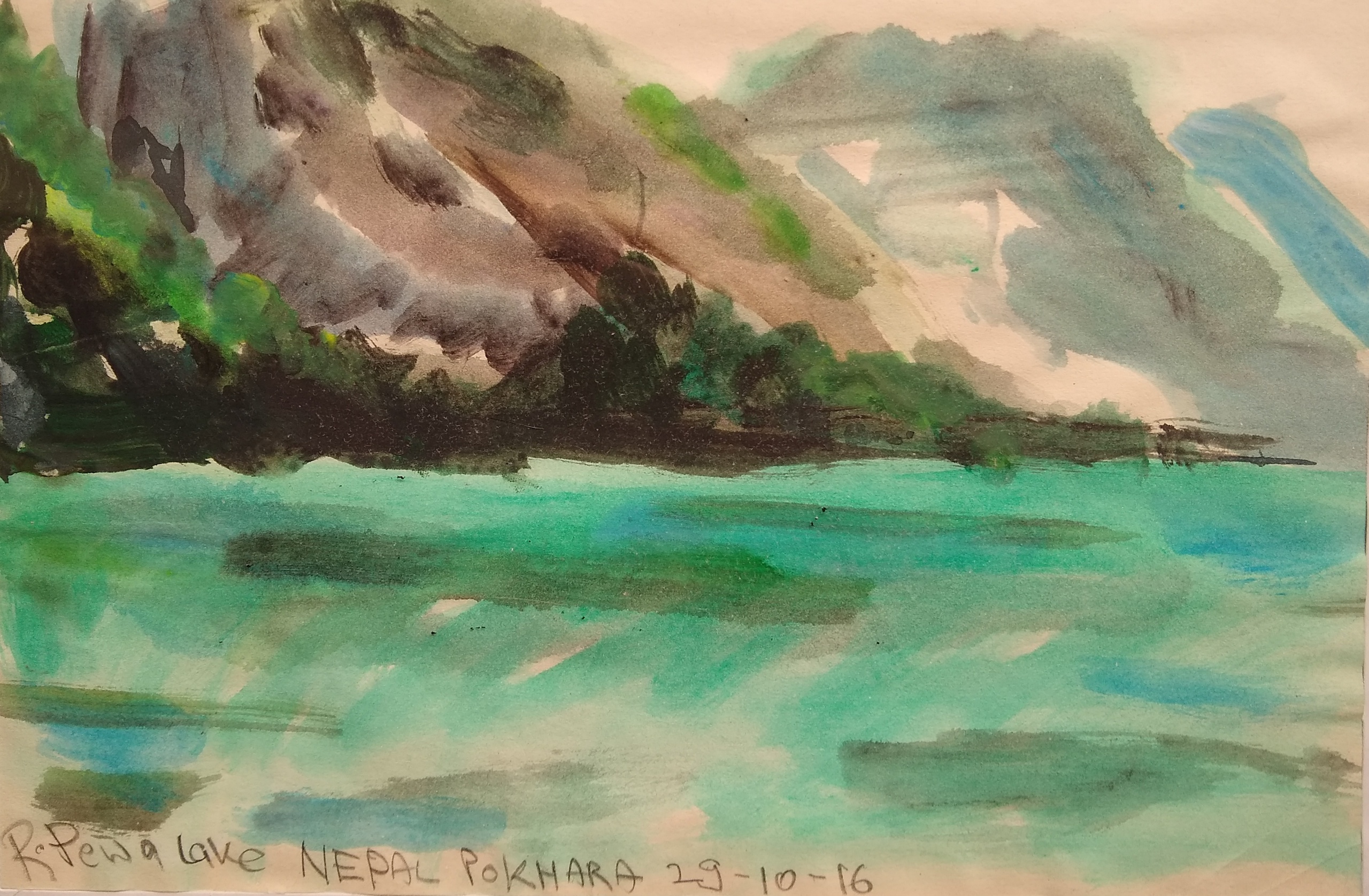 Een snelle impressie met waterverf op sterk absorberend houthoudend papier. Een prachtig meer waaraan de 2e stad van Nepal Pokhara gelegen is. Het Pewa meer.