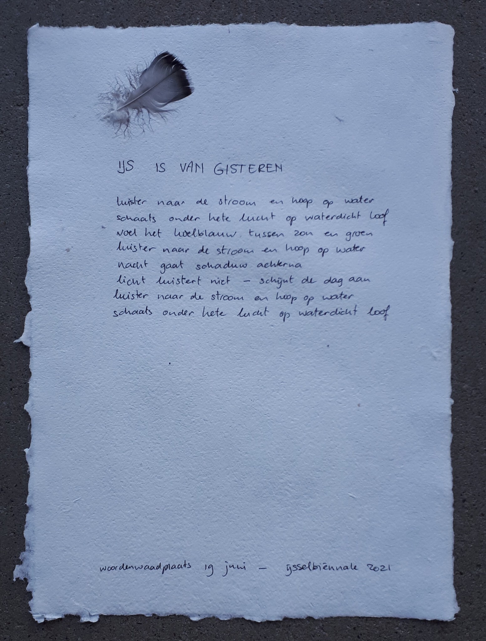Daggedicht 1 van 19 juni 2021 op handgeschept ijsselpapier (linnen met gejutte veer)