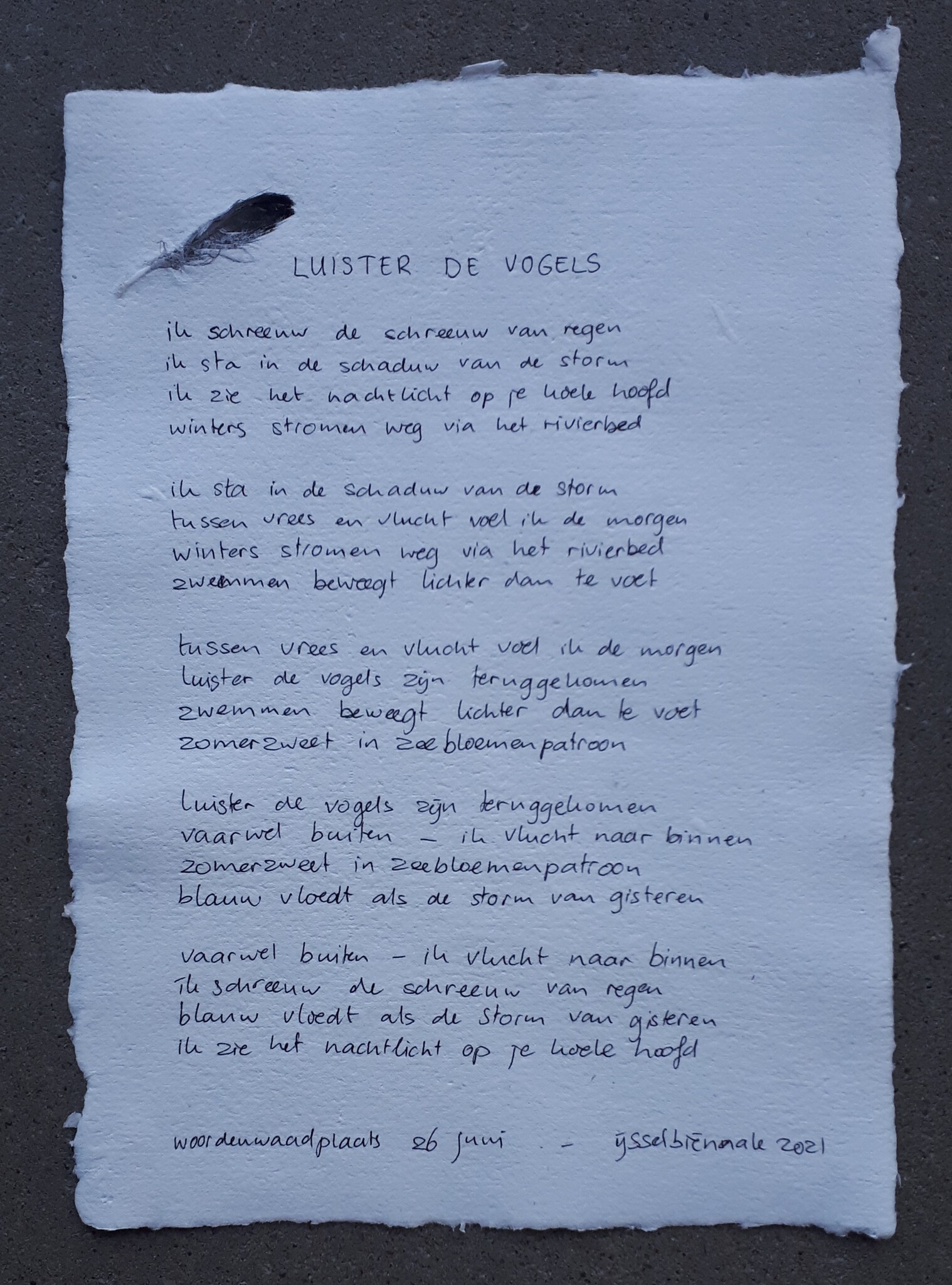 Daggedicht 2 van 26 juni 2021 op handgeschept ijsselpapier (linnen met gejutte veer)