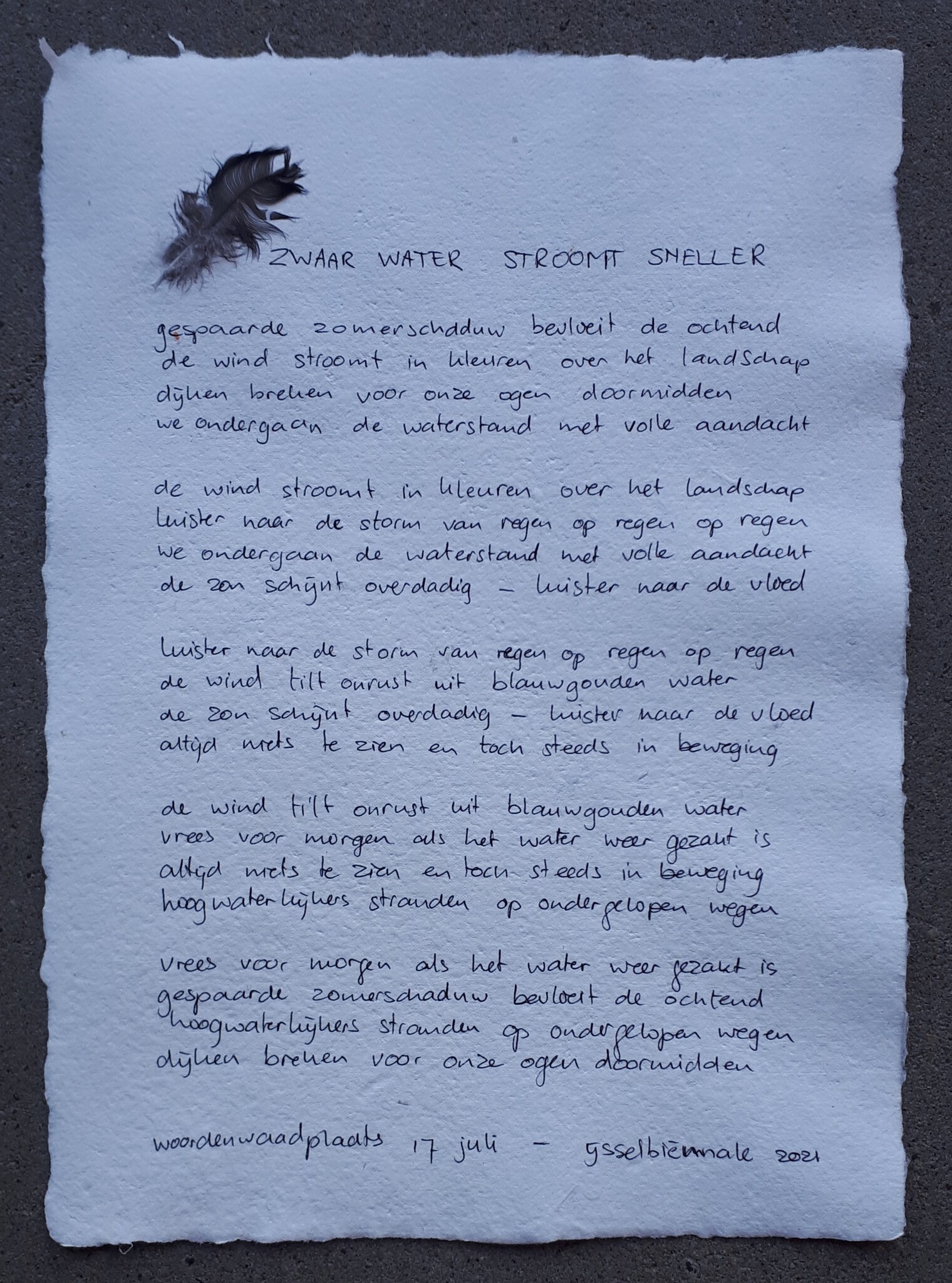 Daggedicht 5 van 17 juli 2021 op handgeschept ijsselpapier (linnen met gejutte veer)