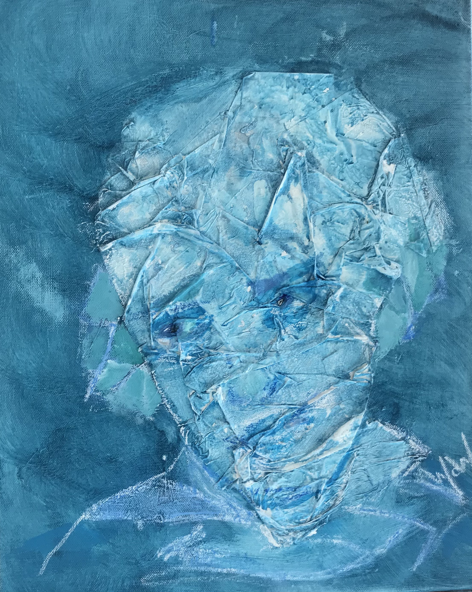 Portret gemaakt van stukjes plastic op doek geplakt en daar over geschilderd.