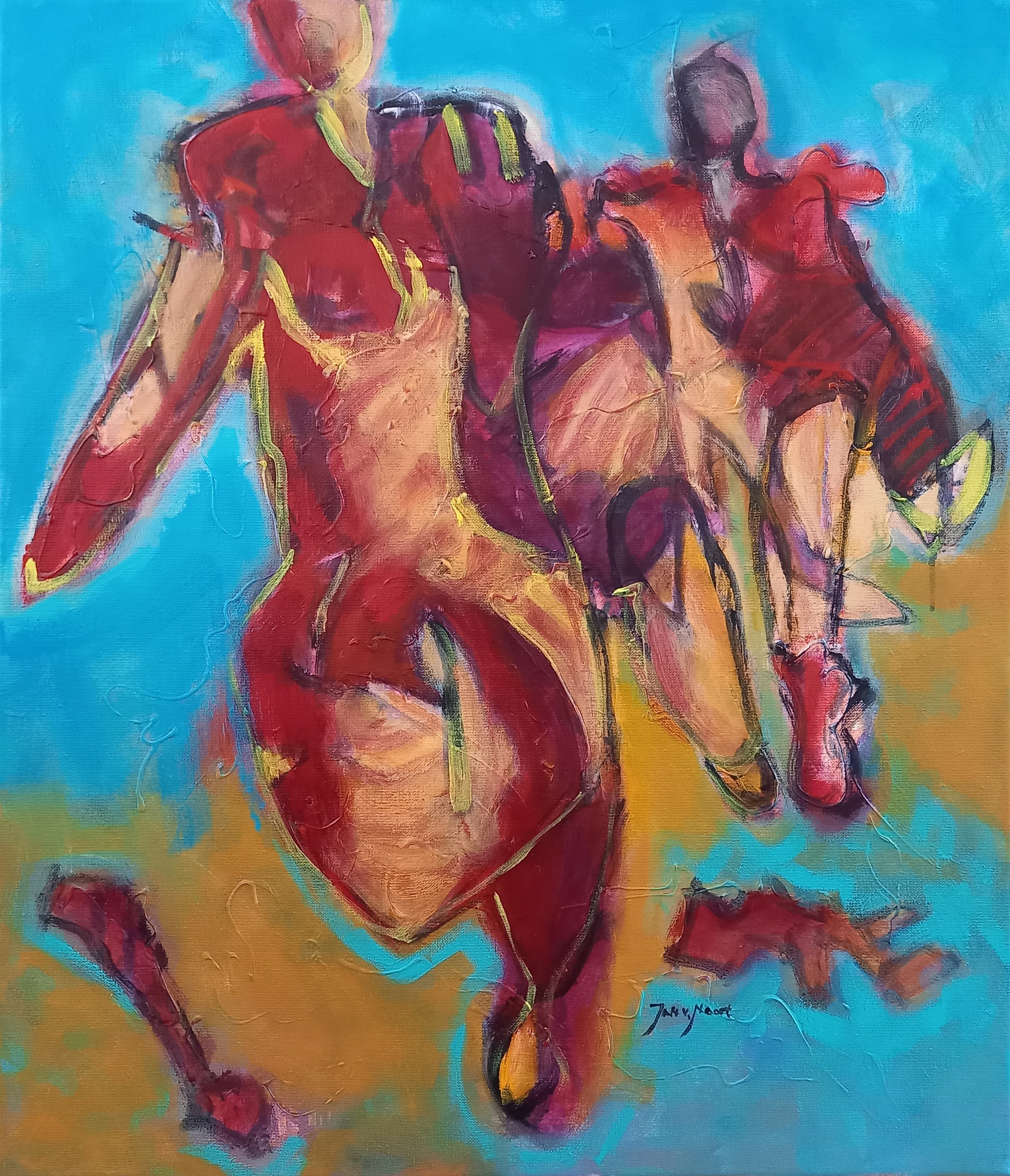 De inspiratiebron voor mijn werk zijn herinneringen en de dagelijkse dingen om mij heen. Een uitbundig kleurenpalet en werken op grotere formaten hebben mijn voorkeur. Tijdens het schilderen ontwikkelt zich, door een spel met kleurvlakken en lijnen, een beeldverhaal met geabstraheerde vormen. Het geschilderde resultaat is een vertaling van wat ik zag en voelde. Het schilderen is een avontuur.