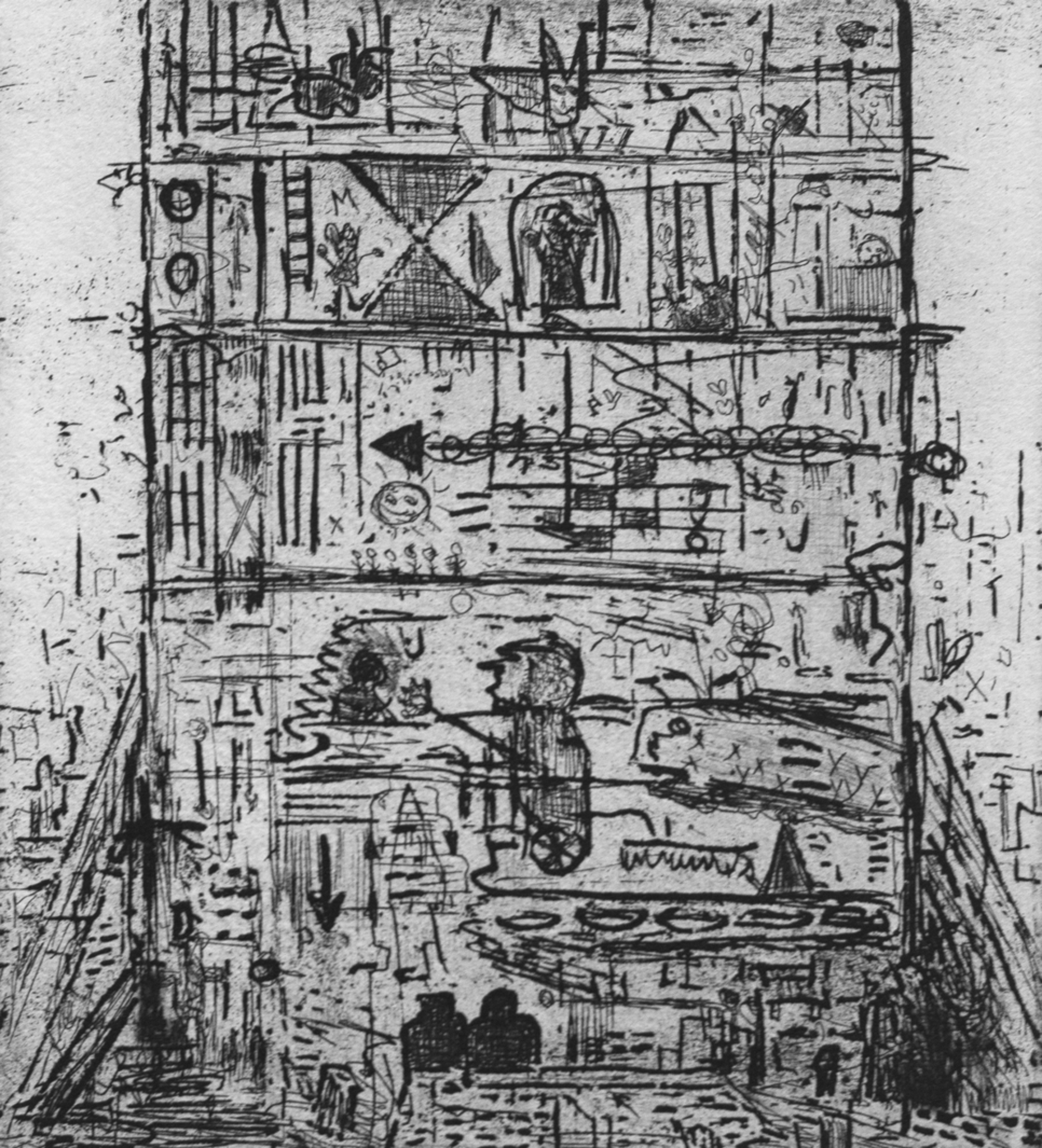 Flatgebouw Printplaat Ets Lijnets Drogenaald Grafiek Grafischekunst Kunst Mensen Hokjes Kleinewereldopzich