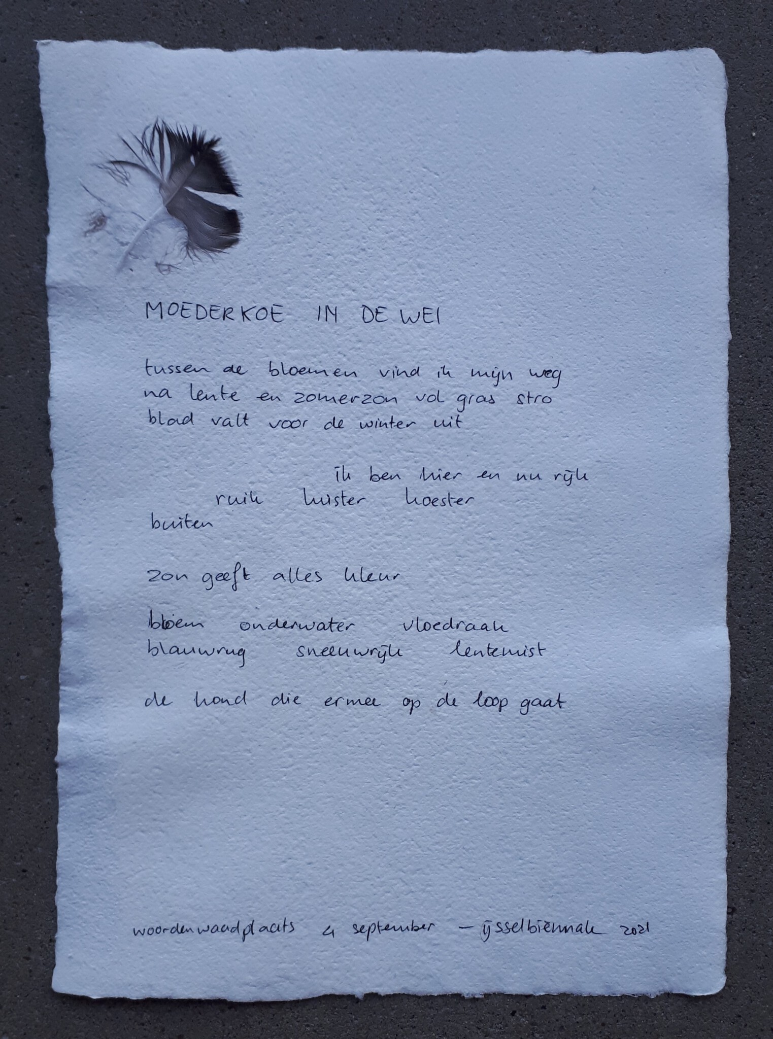 Daggedicht 12 van 4 september 2021 op handgeschept ijsselpapier (linnen met gejutte veer)