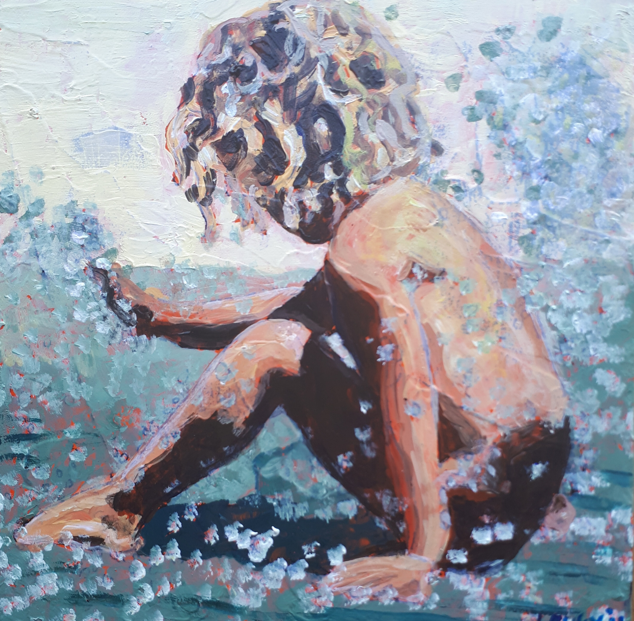 Schilderij Zee Zon Acryl Water Painting Acrylic Gesprek Druppels Jong Sea Young Son Talk Chat Drops Scheltema Louky Loukyscheltema