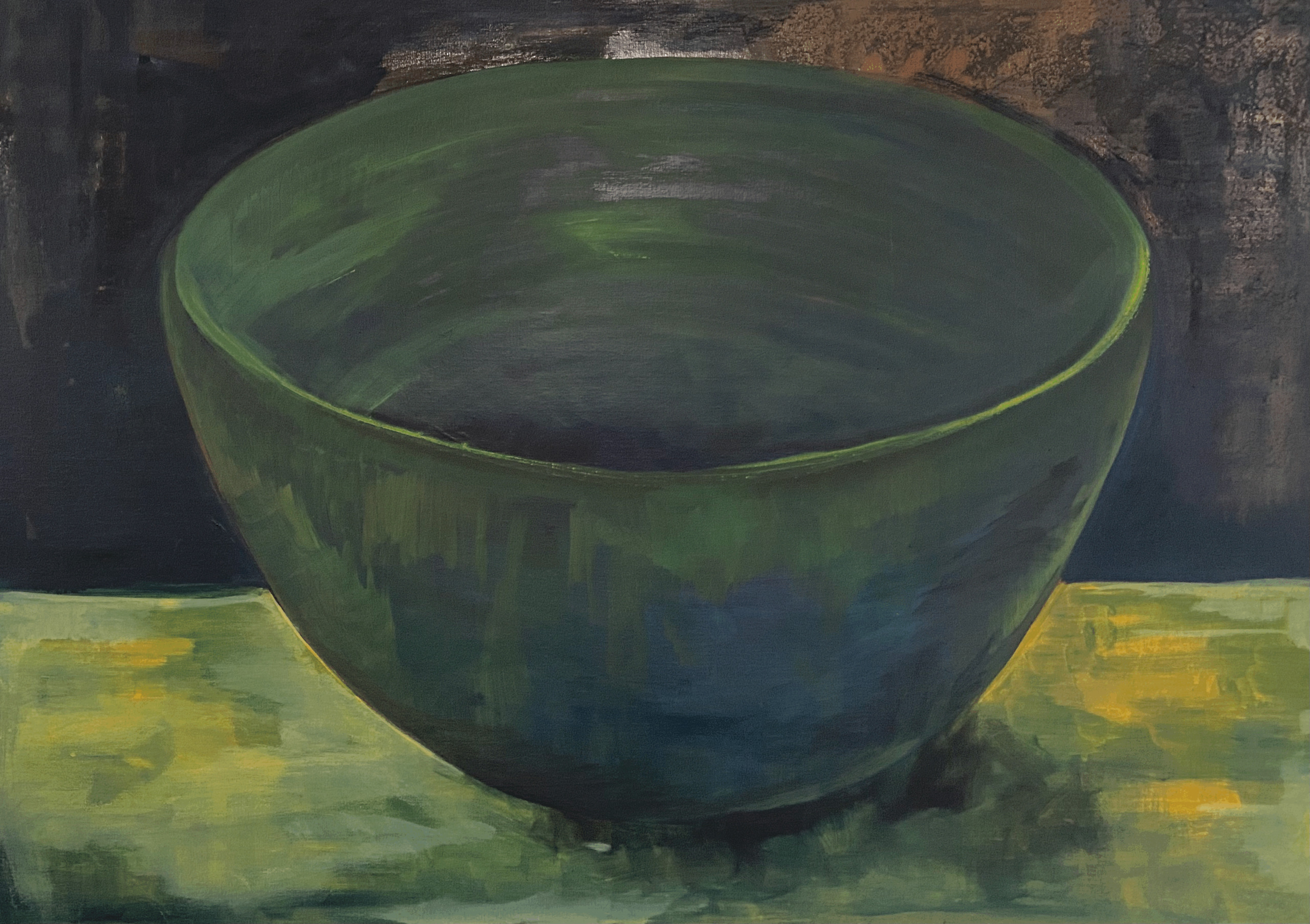 In het maken van mijn schilderijen en installaties onderzoek ik vragen die me bezighouden. En zo onderzoek ik via het schilderen van schalen op een vlak het herkennen van een 'zijn'.