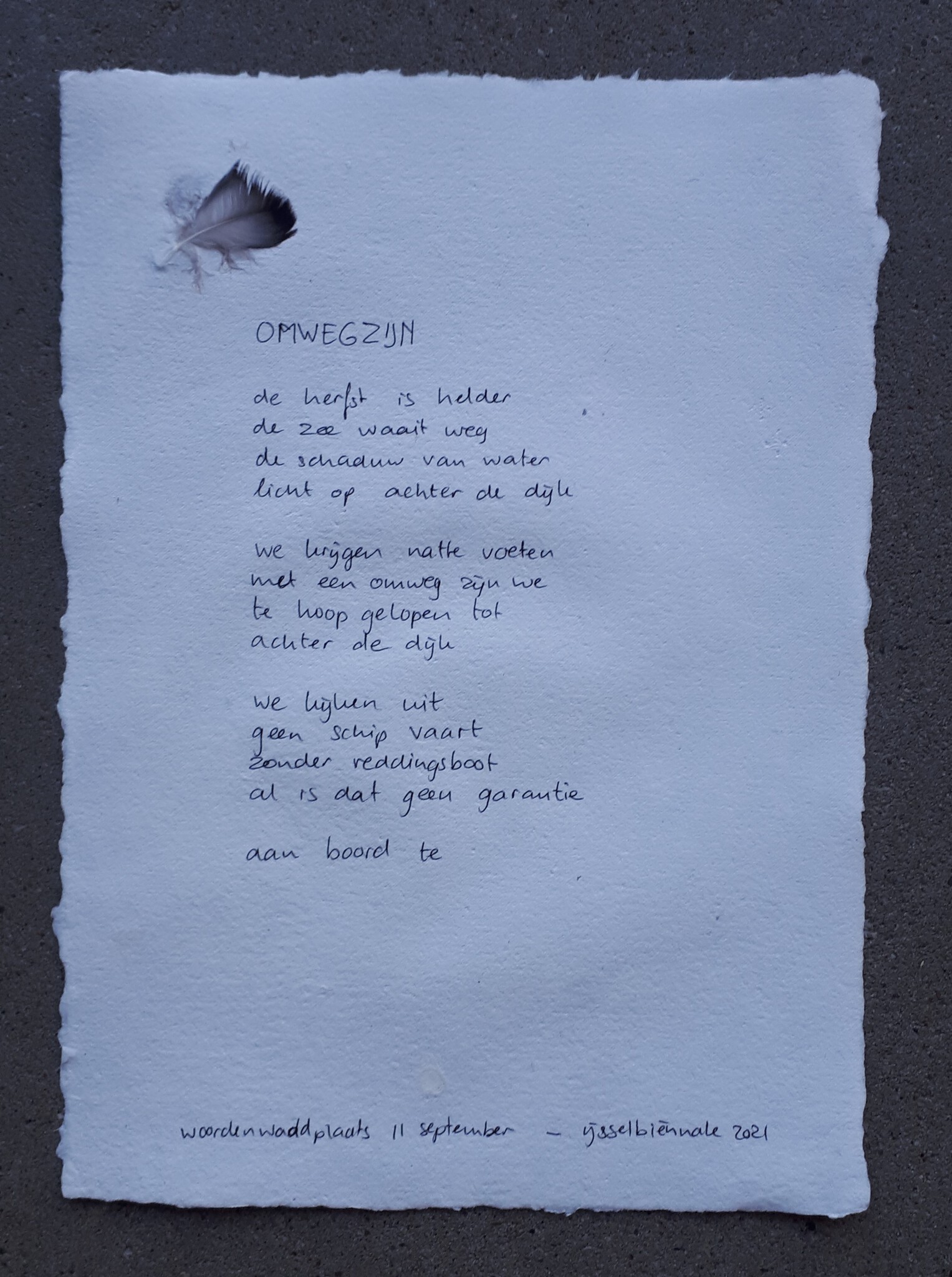 Daggedicht 13 van 11 september 2021 op handgeschept ijsselpapier (linnen met gejutte veer)