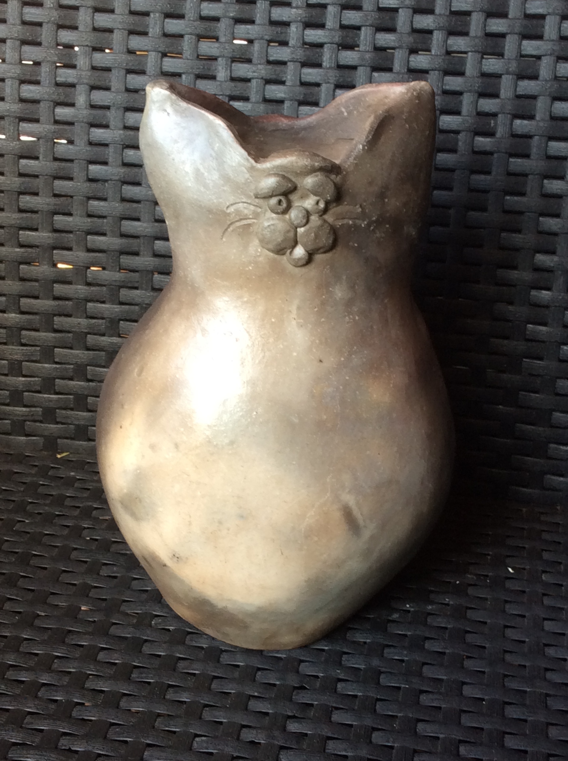 Het blijft altijd leuk om een poes te maken, zeker als je een kattenmens bent. Met pitfire gestookte dikke kater. Voorkant grijs, achterkant met staart is rood met grijs. Hij kan als vaas worden gebruikt en heeft een mooie glans.