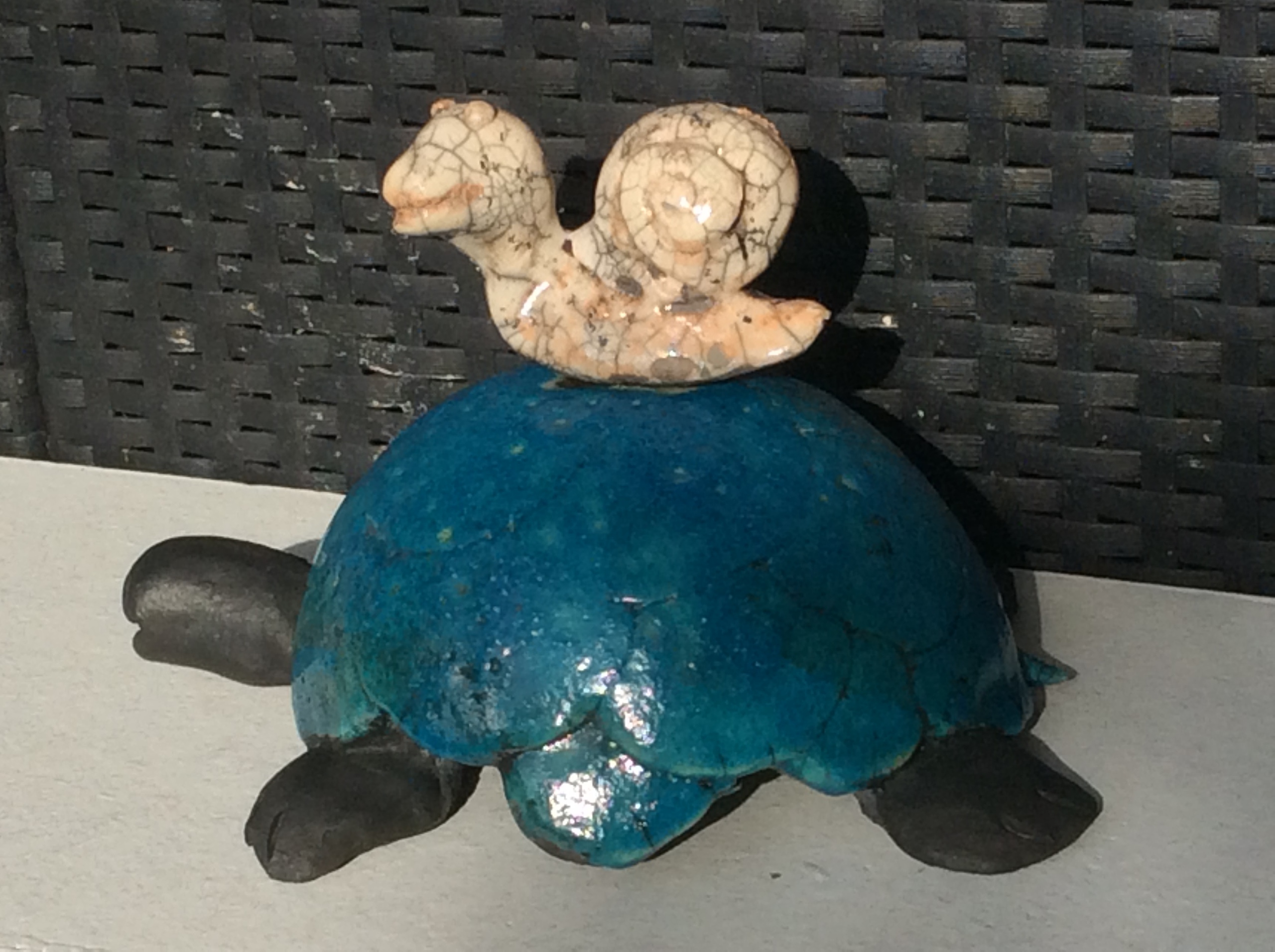 Koeteldekoet is Westfries voor rustig aan. Langzaam aan schuiven deze trage dieren. de schildpad en de slak op zijn rug zijn samen raku gestookt en mooi geglazuurd. Blauw met wit