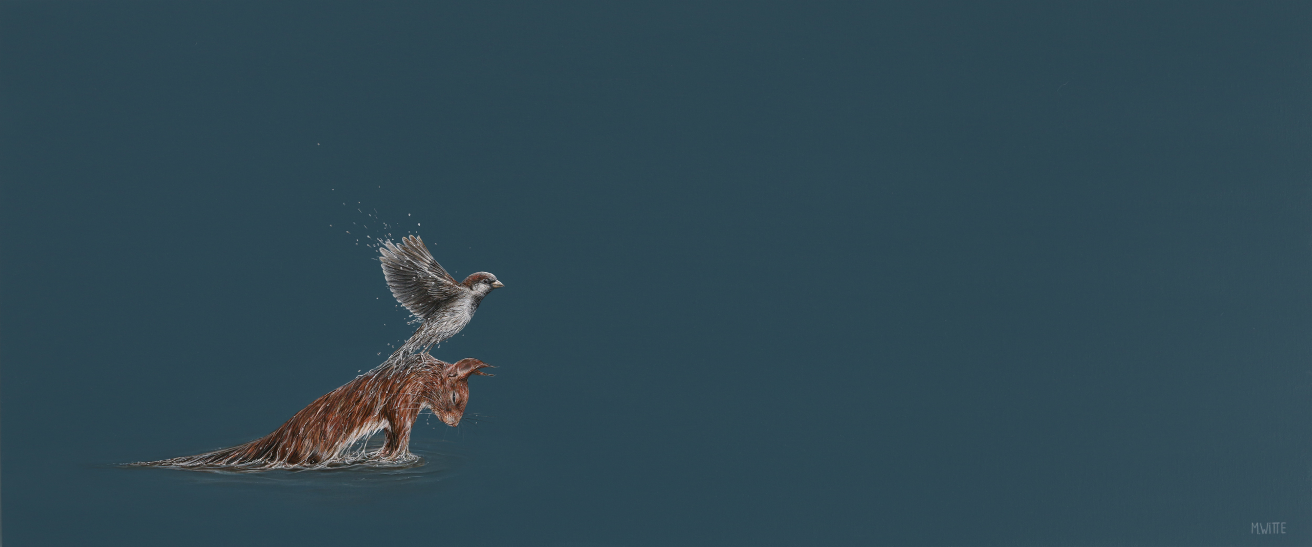 Marcel Witte is een visuele verhalenverteller die de hedendaagse maatschappij subtiel bekritiseert. Zijn schilderijen van dieren tegen een lege achtergrond balanceren tussen realisme en fantasie.
