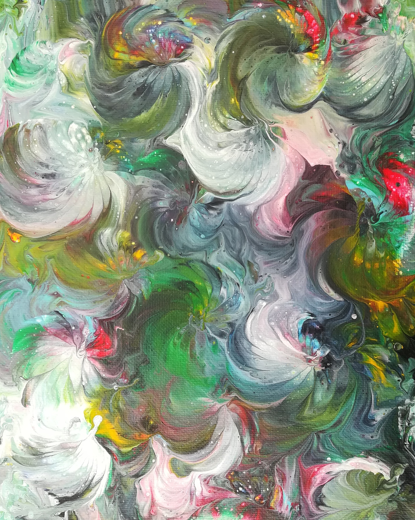 acrylverf verdund met media, acrylgieten en bewerkt met ballon
