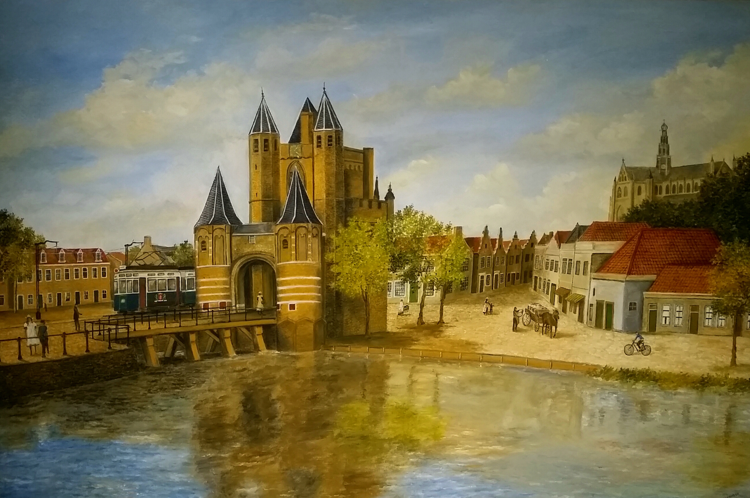 De Amsterdamse Poort in Haarlem rond 1900 met daarachter de blauwe tram. Op de achtergrond is de st. Bavokerk zichtbaar. Het werk is geschilderd in opdracht.