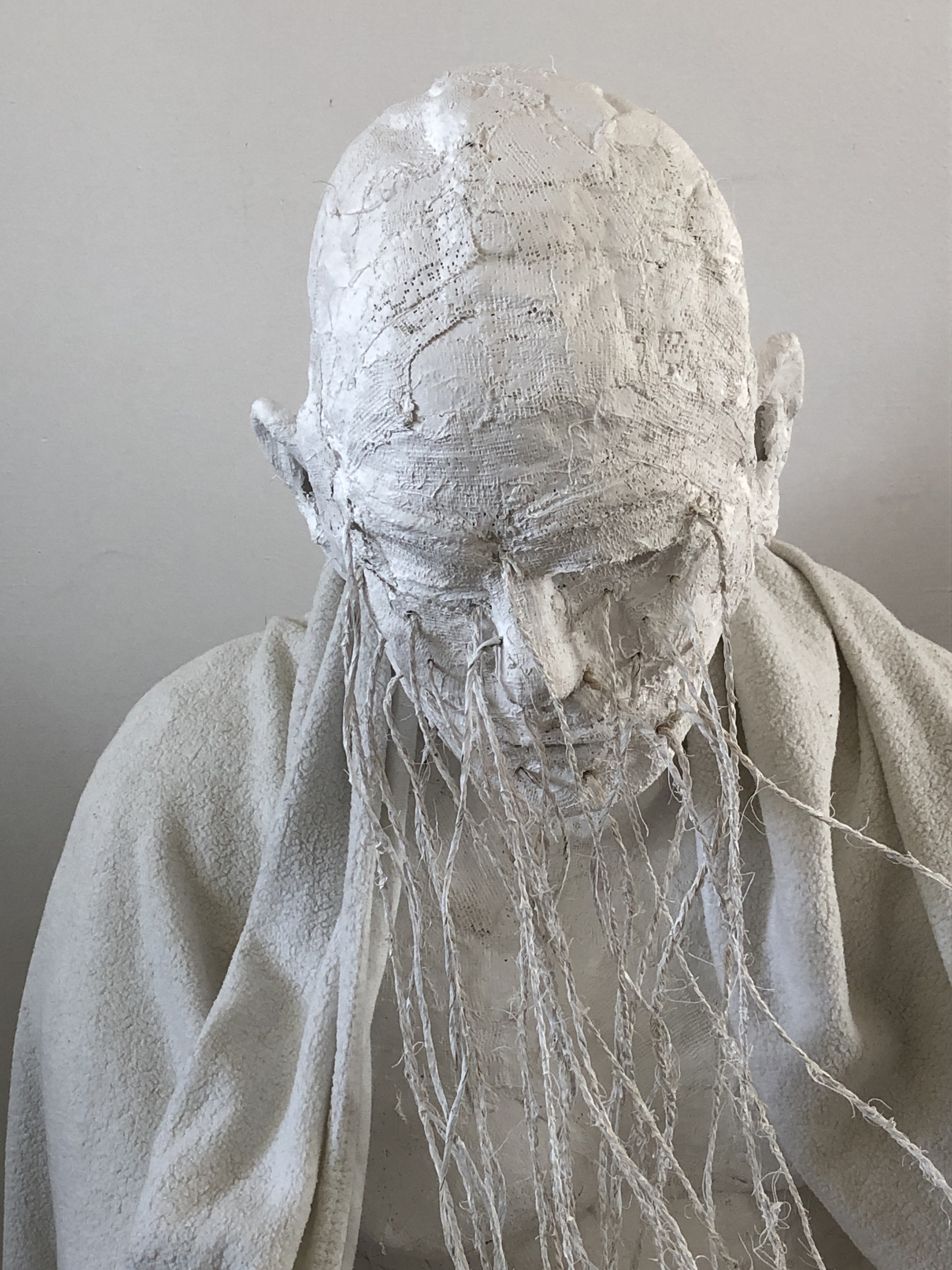 “(He) mourned mankind, and the blindness of men, who thought that the Kosmos had rules and limits that would shelter them from their own freedom. There were no shelters. There were no final purposes. Futility, and freedom, were Absolute” (― Bruce Sterling, Schismatrix ) | Persoon in overpeinzing. Uit zijn gezicht komen/stromen haren/tranen/draden. Deze witte, touwachtige vormen hangen tot ver op de vloer en symboliseren zo de verbintenis tussen de mens en zijn omgeving. | Dit werk is hier uitgebreider te zien. | Het is een oefening voor een ander werk t.b.v. een expositie in 2022.