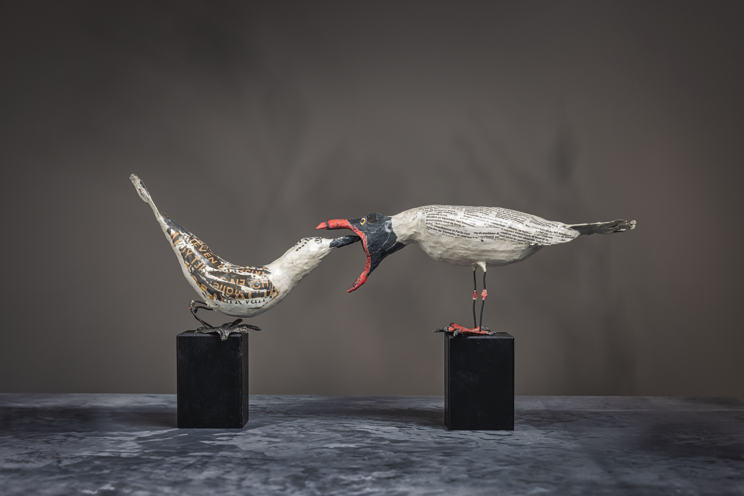 Een volwassen meeuw voedt een jong. De vogels zijn gemaakt van krantenpapier met poten van zachtgegloeid staaldraad. De sokkels zijn houten bedpoten. Geen verf gebruikt. Formaat afhankelijk van opstelling.